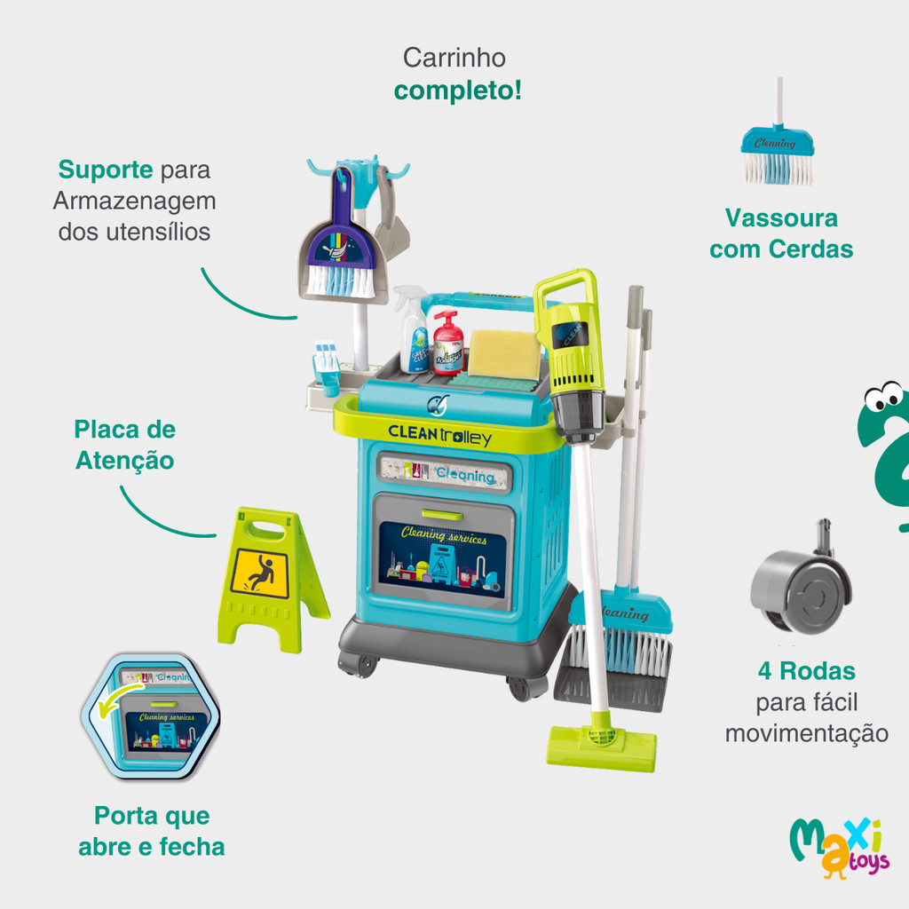 Carrinho de Limpeza Brinquedo Com 40 Acessórios Clean Center – Maxi Toys Diversão, aprendizado e criatividade em um só brinquedo! Transforme a hora de brincar em um momento educativo e superdivertido com o Carrinho de Limpeza Clean Center da Maxi Toys! Ideal para os pequenos que adoram imitar os adultos e se aventurar no mundo da faxina, ele transforma o faz de conta em uma atividade educativa que estimula a autonomia, a criatividade e o senso de responsabilidade das crianças, tudo de forma leve, lúdica e segura. Equipado com 40 acessórios de limpeza realistas, este brinquedo é um verdadeiro centro de atividades que convida os pequenos a mergulhar em um mundo de descobertas. Entre os destaques, está o aspirador de pó elétrico, dando um toque ainda mais real à brincadeira. Esfregão, vassoura, rodo de pia, rodo de chão, balde, pano, escova, produtos de limpeza, plaquinha de aviso (chão molhado), não poderiam faltar nesta brincadeira. Tudo isso em um design funcional e fácil de montar, com abertura frontal e compartimentos organizadores para guardar todos os utensílios com praticidade e 4 rodinhas para fácil movimentação. Indicado para crianças a partir de 3 anos. Certificado pelo INMETRO, o produto garante toda a segurança necessária para o uso infantil, permitindo que pais e responsáveis fiquem tranquilos enquanto os pequenos se divertem. Perfeito para presentear em qualquer ocasião especial. O Carrinho de Limpeza Clean Center da Maxi Toys é garantia de sorrisos e muitas horas de diversão educativa. Principais Características: - Idade Recomendada: A partir dos 3 anos - 40 Acessório de limpeza realistas - 4 Rodas para movimentação - Aspirador de Pó Elétrico (Requer uso de 3 pilhas AA não inclusas) - Incentiva hábitos de organização e higiene - Porta frontal - Design funcional - Combina diversão e aprendizado em uma única caixa - Ajuda a exercitar o cérebro das crianças - Cores vibrantes e atrativas - Estimula a habilidade prática das crianças - Pequenos suportes laterais para organização - Promove um brincar educativo. - Fácil de montar - Produto certificado pelo INMETRO Especificações Técnicas: - Conteúdo da Embalagem: 1 Carrinho de Limpeza, Acessórios + Manual de Instrução. - Composição/Material: ABS E PP - Dimensões do produto aberto: aproximadamente A:62,5 x L: 50 x C.34 cm. - Peso: 2,42kg - Garantia: 90 Dias (Contra Defeito de Fabricação Pelo Fabricante) - Certificação: 004346/2023 - Código do Fabricante: 21858 - EAN: 7899403218586 - Marca: Maxi Toys Imagens meramente ilustrativas, as cores e estampas podem variar de acordo com o lote do fabricante
