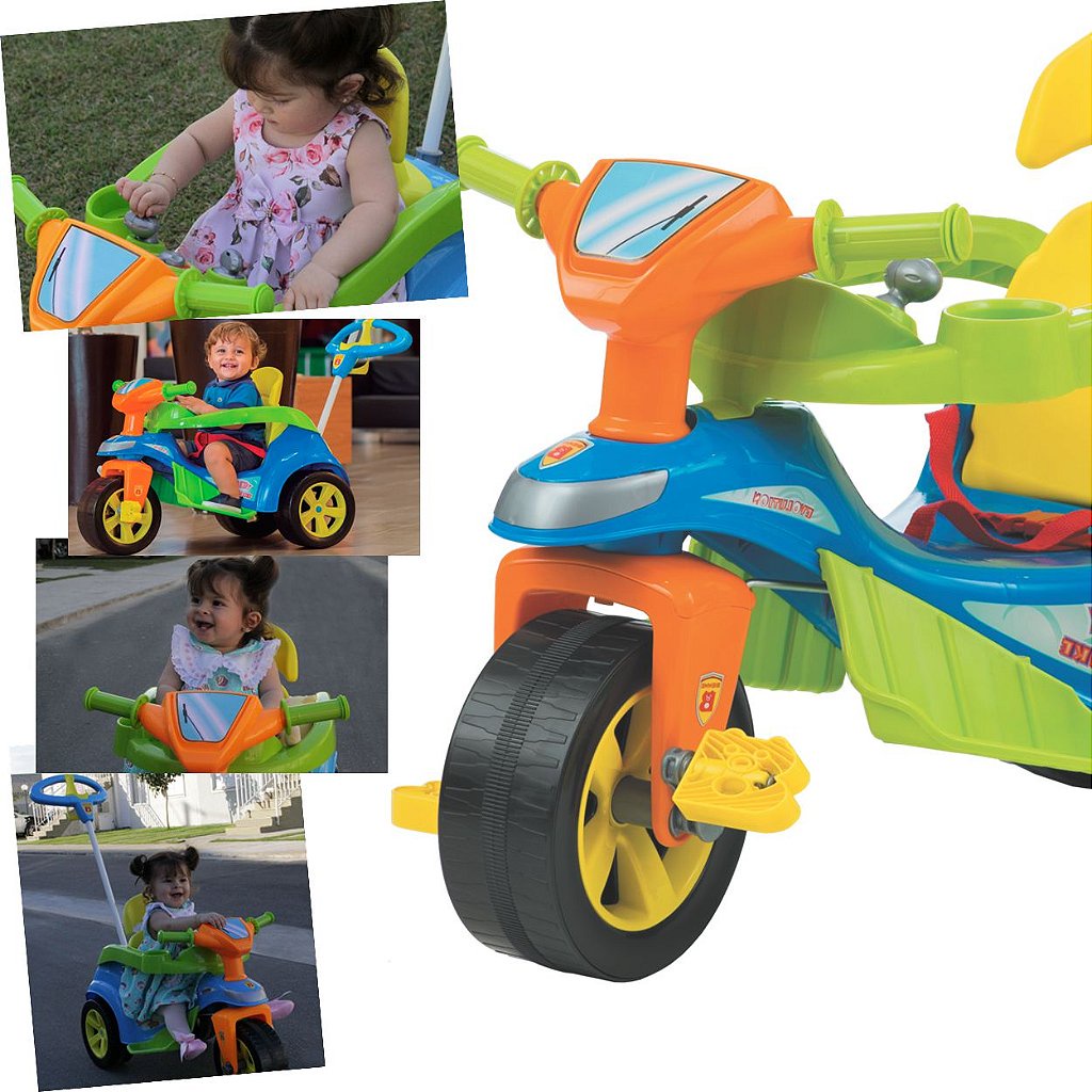 Carrinho de Passeio e Pedal para Bebes Biemme Triciclo Baby Trike Evolution Está procurando um presente perfeito para seu bebê? O Carrinho de Passeio Pedal Triciclo Baby Trike Evolution da Biemme vai proporcionar muito conforto e diversão nos passeios do seu bebê! E você vai conhecer TUDO sobre este lindo brinquedo aqui na Maçã Verde Baby! Presente perfeito para bebês de 12 meses até 25kg! Quem não gosta de ganhar um presente, não é verdade? Com o Triciclo Baby Trike Evolution da Biemme você não vai errar e seu bebê terá um brinquedo que vai durar por muuuito tempo! O Triciclo Baby Trike Evolution da Biemme é um brinquedo 2 em 1 que acompanha o crescimento do bebê e pode ser utilizado desde os 12 meses de idade até 25kg! Ele pode ser utilizado para passeios ou na função de pedal. Função passeio: empurrador, proteção e muita diversão a bordo do Triciclo Baby Trike Evolution Para os bebês de 1 aninho que ainda não conseguem pedalar sozinhos, você pode utilizar a função passeio. O brinquedo possui aro de proteção para evitar que o bebê caia ou se desequilibre no brinquedo. Com o assoalho de proteção, os pézinhos não vão bater nos pedais e o empurrador vai ajudar você a conduzir o brinquedo durante os passeios. A diversão é garantida para os pequenos! O empurrador do Carrinho de Passeio Triciclo Baby Trike Evolution da Biemme possui um suporte para carregar uma bolsa ou sacola. Acredite: isso vai facilitar muito durante os passeios! Além disso, o Carrinho Triciclo Baby Trike Evolution da Biemme possui porta-objetos para transportar mamadeira, suco, água ou outros objetos, rodas largas com calotas e faixas de rodagem em relevo, apoio confortável removível para os braços com conjunto didático, apoio para os pés removível com proteção, roda dianteira com sistema de pedais removíveis, cinto de segurança regulável de três pontos, haste articulada removível em aço carbono resistente com porta copo e gancho para pendurar sacolas e guidão com manoplas. Carrinho Passeio e Pedal Biemme Triciclo Baby Trike Evolution O novo triciclo da linha Baby Trike Evolution, possui cores sofisticadas que dão um toque especial de elegância e delicadeza. Foi especialmente desenvolvido para os príncipes e princesas que preferem cores diferentes das tradicionais. Além de manter as tradicionais vantagens do encosto reclinável, ajuste do pescoço, apoia pés e braços, haste articulável, porta copos e porta objetos. 12+ meses Rodas largas com calotas e faixas de rodagem em relevo Apoio confortável removível para os braços com conjunto didático Contém porta mamadeira Apoio para os pés removível com proteção Roda dianteira com sistema de pedais removíveis Cinto de segurança regulável de três pontos Porta objetos na parte traseira Haste articulada removível em aço carbono resistente com porta copo e gancho para pendurar sacolas Guidão com manoplas Design moderno, colorido e com adesivos divertidos. Segurança - O anel de proteção levanta para facilitar o acesso da criança. Na função Passeio, o adulto empurra o carrinho através da haste-guia, ela é metálica e de fácil remoção. Tem gancho superprático para pendurar uma bolsa ou sacola. Na função Pedal, retirando a haste-guia, o apoio de pés e o anel de proteção, a criança pode pedalar e brincar sozinha desenvolvendo o senso de direção e coordenação motora. Contém: 1 Triciclo Baby Trike Evolution 1 Haste/Empurrador 1 Suporte para bolsa 1 Aro Protetor 1 Par de Apoio de Pés 1 Manual de Instruções Habilidades desenvolvidas: Compreensão de causa e efeito, Coordenação entre olhos e pés, Coordenação motora fina – mãos e dedos, Curiosidade e descoberta, Habilidades Sensoriais, Coordenação entre Olhos e Mãos, Coordenação motora grossa – Braços e Pernas, Atenção e Concentração, Compreensão de Causa e Efeito, Curiosidade e Descoberta. 2 em 1: acompanha o crescimento do bebê Função passeio: empurrador com suporte para bolsa para os pais controlarem o brinquedo. Pode ser instalado com aro de proteção. Função pedal: basta remover o assoalho, o empurrador e o aro de proteção. A própria criança controlará a direção do brinquedo e os pedais. Passeio: direção e rodas guiadas pelo empurrador Pedal: rodas com borracha para não derrapar Espaço para guardar brinquedos Idade recomendada: 1 a 3 anos Peso máximo suportado: 25kg Composição: Polietileno, plástico, metal e borracha Medidas do Triciclo Baby Trike Evolution da Biemme: Altura 36,5 cm x Largura 44 cm x Comprimento 78 cm Peso 5,32kg Certificado de Registro INMETRO CE-BRI/INNAC-00658-01A NM300/2002 - INNAC OCP 061 SBAC Segurança do Brinquedo Produto novo, original, lacrado com nota fiscal e certificado de garantia de fábrica válido por 3 (três) meses! Aproveite e garanta agora mesmo o seu aqui Carrinho de Passeio e Pedal para Bebe Triciclo Baby Trike Evolution da Biemme na Maçã Verde Baby! Ficamos no aguardo de sua compra!