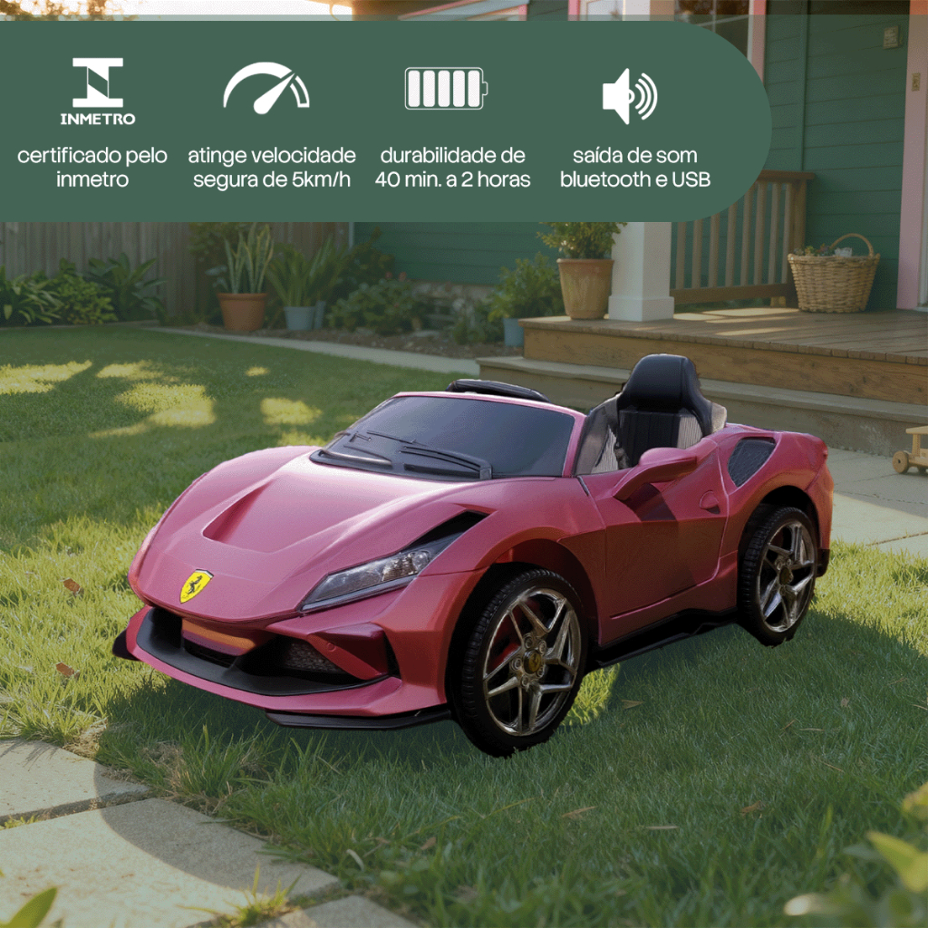 Mini Carro Infantil Elétrico com Controle Remoto Ferrari 12V PRODUTO CERTIFICADO PELO INMETRO. O mini veículo pode ser controlado pela criança por meio de acionamento de pedal e controle da direção, assim como, por um adulto utilizando o controle remoto (alcance de até 20 metros). É ideal para crianças de 2 anos a 7 anos, com capacidade de até 35 kg. Atinge velocidades seguras até 5 km/h. Possui marcha para frente, ré e neutro. Simplesmente o melhor do passeio com a maior aventura. Tornando-se um presente ideal para qualquer ocasião, seja para um Aniversário, Natal ou Dia das Crianças, este brinquedo certamente será um sucesso. Cores Disponíveis: * Vermelho * Rosa * Azul Especificações Técnicas: - Recomendado Para crianças até 07 anos ou ou com peso máximo de até 35kg (Idade recomendada pode variar dependendo do tamanho da criança, verifique sempre as medidas do produto e o peso máximo permitido) - Direção 2 em 1, pode ser controlado tanto a distância pelo controle remoto, como manualmente pela criança de dentro do veículo. - Recomendado somente 1 criança por vez. - Bateria recarregável de 2 x 6V ( Equivalente a 12V ) - Tempo de carregamento: de 8 a 12 horas - Duração da bateria: de 40 min à 1 hora - Velocidade máxima 5 km/h - Acompanha carregador bivolt - Controle remoto funciona com 2 pilhas AA (Não Incluídas) - Peso Aproximado do Produto: 30kg - Peso máximo suportado: 35 Kg - Medidas do produto (Aproximadas): 114cm comp. x 70 cm larg. x 45 cm alt. - Material do Assento: Plástico resistente ajustável - Material das Rodas: Plástico resistente - A distância aproximada entre o encosto do banco até o volante (medidas aproximadas): +/-40cm - A altura aproximada da base do carrinho até o volante (medidas aproximadas): +/- 25cm - Cinto de segurança de dois pontos Perguntas: - Tem Ré? sim - Luz de Led no farol dianteiro e traseiro? sim - Acionamento da buzina e som do motor no volante? sim - Tem rádio? sim - Tem Entrada para MP3? sim - Tem Bluetooth ? sim - Botão para aumentar/diminuir o volume? sim - Botão de Liga/Desliga que emite ronco do motor? sim - Pedal para que a criança possa acelerar? sim - Cinto de segurança com regulador? Sim Conteúdo da Embalagem: - 01 Carro Elétrico Infantil - 01 Carregador Bivolt (110V/220V) - 01 Controle Remoto OBS: Veículo elétrico irá desmontado e deverá ser montado por um adulto. Acompanha Manual e sempre estamos disponivel pelo chat da venda para qualquer ajuda ou esclarecimento ACESSANDO A BATERIA E INICIALIZANDO O CARRINHO: As baterias estão localizadas na parte interna dos veículos, debaixo do banco/assento do veículo. Para o melhor desempenho da bateria, nós enviamos o fio Vermelho (negativo) desconectado da bateria, por isso, você precisa acessá-la para conectar o fio e ligar o veículo. Obs.: pode ser que tenha uma pequena capinha plástica no conector do fio vermelho na bateria. Remova-a e, em seguida, encaixe completamente o fio. PRIMEIRA RECARGA E USO: Para o melhor desempenho da bateria, a primeira recarga tem que ser feita por até 12h, não mais que isso e não menos que 10h. As demais recargas podem ser feitas de 6h a 8h de duração. PAREAMENTO DO CONTROLE REMOTO: Pode ser que ele não funcione imediatamente após a inicialização do produto. Você precisará fazer a sincronização do controle. 1 - com o carrinho desligado, pressione ao mesmo tempo a seta para cima e para baixo do controle, até a luz no meio do controle começar a piscar. 2 - quando a luz do controle estiver piscando, ligar o carrinho. 3 - ao ligar o carrinho a luz do controle irá parar de piscar e ficar fixa, nesse momento a sincronização está concluída. Minha compra é segura? Sim! Toda transação na Shopee é feita em ambiente 100% seguro. O produto tem nota fiscal e garantia? Sim, com nota fiscal e garantia de 2 meses direto com o vendedor. Posso devolver se não gostar? Claro! Você tem 7 dias para devolução por arrependimento com reembolso integral. O envio é rápido? Sim! Todos os pedidos aprovados até as 13h são despachados no mesmo dia. Tem produto em estoque? Sim, pronta entrega! Enviamos para todo o Brasil. Atendimento rápido e especializado.