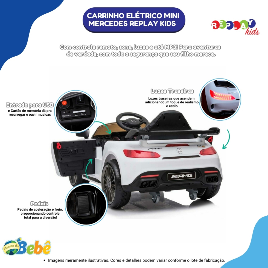 Carrinho Elétrico Infantil Mini Mercedes GT Replay Kids Para garantir a diversão da criançada, a Replay Kids trouxe os mini carrinhos elétricos que vai tornar o companheiro de aventura dos pequenos. Mini veículo Mercedes GT é um modelo completo e com grande estilo. Possui painel todo equipado trazendo um realismo que vai além de um brinquedo, com luzes, sons, entrada para MP3, cartão de memória e USB. Além de um motor capaz de suportar até 30kgs, sendo acomodado por apenas um condutor. Portas que abrem e fecham, botão para acionar (frente e ré), faróis dianteiros e traseiros que acendem, super ágil atinge a velocidade de até 5km/h, controlado via Remote Control (Controle Remoto) para crianças menores com alcance de distância de 20 metros, ou manualmente sem auxílio do controle remoto por meio do acionamento do pedal do acelerador e volante. Assento espaçoso com cinto de segurança que garante todo conforto e segurança para a criança. Bateria recarregável 12V, volante com buzina, partida com botão, retrovisor espelhado, farol e lanterna que acedem de verdade, indicador de bateria, músicas programadas, absorção de impacto nas rodas com haste de tração, motor 25W/35W super potente garantindo aquela aventura que toda criança adora. Indicado para crianças a partir de 3 anos, ideal para todos os momentos e pode ser usado em espaços interno e externos. Produto certificado pelo INMETRO. Principais Características: - Idade recomendada: A partir de 3 anos -ACOMPANHA FONTE/CARREGADOR BIVOLT - Quantidade de lugares: 1 lugar - Peso suportado: 30kgs - Bateria 12V recarregável - Velocidade: 3 a 5km/h aprox. - Pode ser controlado por controle remoto (para crianças menores) - Controlado manualmente sem auxílio do controle remoto (para crianças maiores) - Alcance do controle remoto de 20 metros - Portas que abrem - Botão de partida - Absorção de impacto nas rodas com haste de tração - Faróis e lanternas que acedem de verdade - Botão para acionar (Frente e Ré) - 4 Rodas - Assento espaço com cinto de segurança - Retrovisor espelhado - Painel com sons e músicas programadas - Painel com luzes - Entrada para MP3, USB, Cartão de memória - Ajuste de volume - Motor 25W/35W - Botão Liga/Desliga - Indicador de bateria - Tempo de carregamento da bateria: De 8 à 10 horas - Tempo de funcionamento do produto: De 1 à 2 horas aprox. - Bateria do Controle remoto: 2 Pilhas AAA (Não inclusas) - Sistema de Direção: Volante ou controle remoto - Ideal para lugares interno e externo - Certificado pelo INMETRO - Disponível nas cores ( Preto e Branco) Especificações técnicas: - Conteúdo da Embalagem: 1 Carro Elétrico, 1 Controle Remoto + Manual de Instruções. - Dimensões do Produto (CxLxA): 97cm x 50cm x 40cm (Aproximadamente) - Peso: 17,5 kg (Aproximadamente) - Material: Plástico - Garantia: 3 Meses (Contra Defeito de Fabricação pelo Fabricante) - Certificação INMETRO: 010641/2023 - Certificação ANATEL: 12516-23-15907 - Código do Fabricante: 21722/ 21599 - EAN: 7899403217220 / 7899403215998 - Marca: Replay Kids Imagens meramente ilustrativas, as cores e estampas podem variar de acordo com o lote do fabricante.