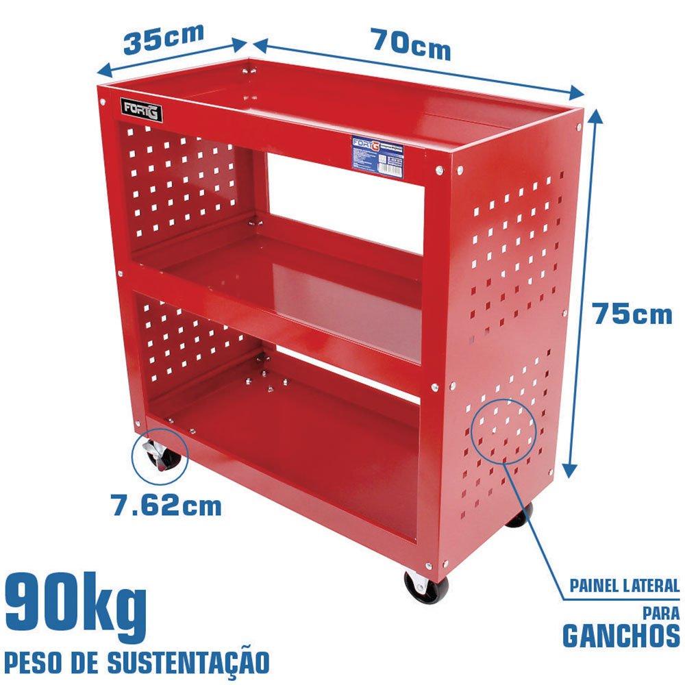 É perfeito para sua oficina como estação de trabalho ou transporte de ferramentas. Resistente e durável, feito com 3 prateleiras em chapa de aço com tratamento de antioxidante e pintura eletrostática a pó epóxi. - Especificações Técnicas: :: Dimensão Total: 700x350x755mm, com rodízio :: Bandejas: 700x350x50mm • Espessura 0.5mm :: Painel Lateral: 0.6mm :: Diâmetro do Furo do Painel: - Furo: 10x10mm - Espaço entre os furos: 38mm :: Peso de sustentação: 90kg (30kg por bandeja) :: Rodízios: - Material: PP - Tamanho: 76,2mm :: Peso total: 8.9kg - Conteúdo da Embalagem: :: 1 Carrinho com Prateleiras - Garantia: 6 Meses - 7908591701029 Ref.: FORTGPRO-FG6001S Marca.: FORTGPRO