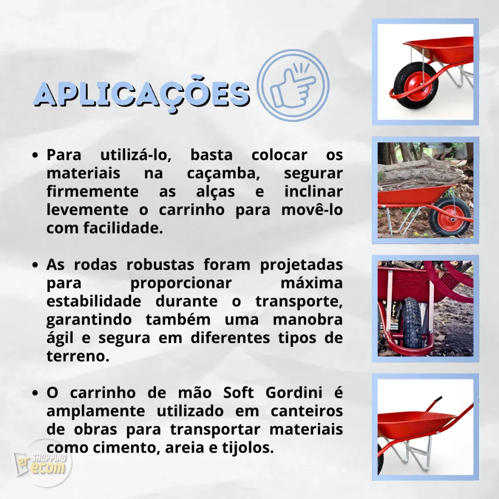 Carrinho de Mão ESFERA Soft Gordini 45L – A união de resistência, praticidade e conforto Se você procura um carrinho de mão durável, estável e de fácil manuseio, o ESFERA Soft Gordini é a escolha ideal. Desenvolvido com caçamba em aço carbono galvanizado e estrutura reforçada, ele foi pensado para quem precisa de um equipamento confiável, seja para uso em obras, jardinagem ou transporte de materiais no dia a dia. Sua caçamba conta com bordas arredondadas, que evitam o acúmulo de resíduos e facilitam o despejo, enquanto o varal ergonômico com punho plástico garante firmeza e conforto ao operador. O pneu é enviado calibrado de fábrica, pronto para uso imediato. Diferenciais que fazem a diferença: -Estrutura reforçada com solda contínua, garantindo maior durabilidade -Peças de montagem galvanizadas para prolongar a vida útil -Bordas arredondadas na caçamba para facilidade no despejo -Estabilidade assegurada mesmo em terrenos irregulares -Pintura vermelha com acabamento de qualidade superior Especificações Técnicas: º Marca: ESFERA º Modelo: Soft Gordini º Capacidade da caçamba: 45 litros (líquido) | 60 litros (a seco) º Material da caçamba: Aço carbono, chapa 26 galvanizada º Espessura da chapa: 0,45 mm º Medidas do carrinho: 81 × 62 × 15 cm º Medida com braço estendido: 145 cm º Peso aproximado: 7 kg º Varal ergonômico com punho plástico º Sistema de giro da roda em eixo reforçado º Pneu enviado já cheio e calibrado º Pintura líquida na cor vermelha º Envio desmontado, com manual de fácil montagem O Carrinho de Mão ESFERA Soft Gordini é a combinação ideal de resistência, praticidade e qualidade superior, sendo a ferramenta certa para quem busca eficiência no trabalho e durabilidade no investimento. Garantia do vendedor: 90 dias