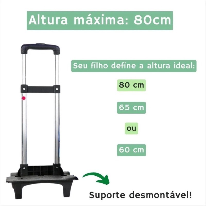 | Carrinho Mochila Escolar C/Trava universal Alumínio Rodas Silicone este produto | R$ 76,41 | 10% | 4.6/5 | 5 |