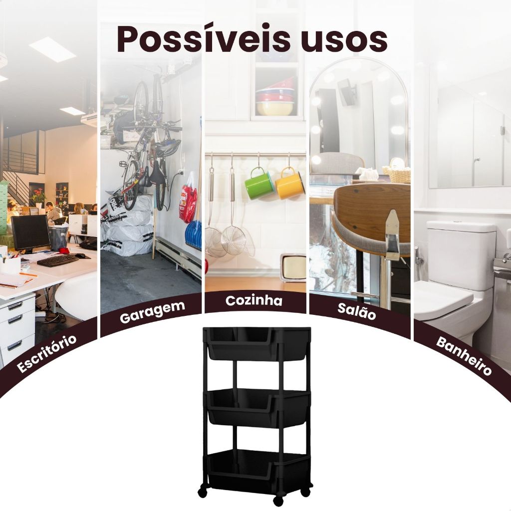 CARRINHO ORGANIZADOR MULTIUSO 3 PRATELEIRAS COM RODINHA- KONTUZ O Carrinho Organizador possui três prateleiras espaçosas com abertura que facilita colocar e pegar os objetos, além disso, conta com rodinhas com trava para melhor mobilidade e firmeza do produto. O carrinho conta também com pequenos ganchos para pendurar sacolas. As barras e as prateleiras são feitas de plástico, suportam até 10Kg. ESPECIFICAÇÕES: * Estrutura de plástico; * Ganchos para Sacola; * Fácil de montar; * Pode usar em lugares úmidos; * Fácil de limpar; * Rodinhas giro 360° e com trava; * Marca: KONTUZ. CONTEÚDO DA EMBALAGEM: * 1 Carrinho Organizador desmontado; * 4 Ganchos de Sacola; * Manual de montagem. MEDIDAS DO PRODUTO: * (CxAxL) 35x67x23cm; IMPORTANTE: Garantia: 3 Meses a partir da data de recebimento - para defeitos de fabricação (não cobrimos mau uso). *Todos os Direitos Reservados Em caso de cópia dessa descrição e fotos, os responsáveis serão cobrados de acordo com a Lei (9.610/98) de Direitos Autorais.*