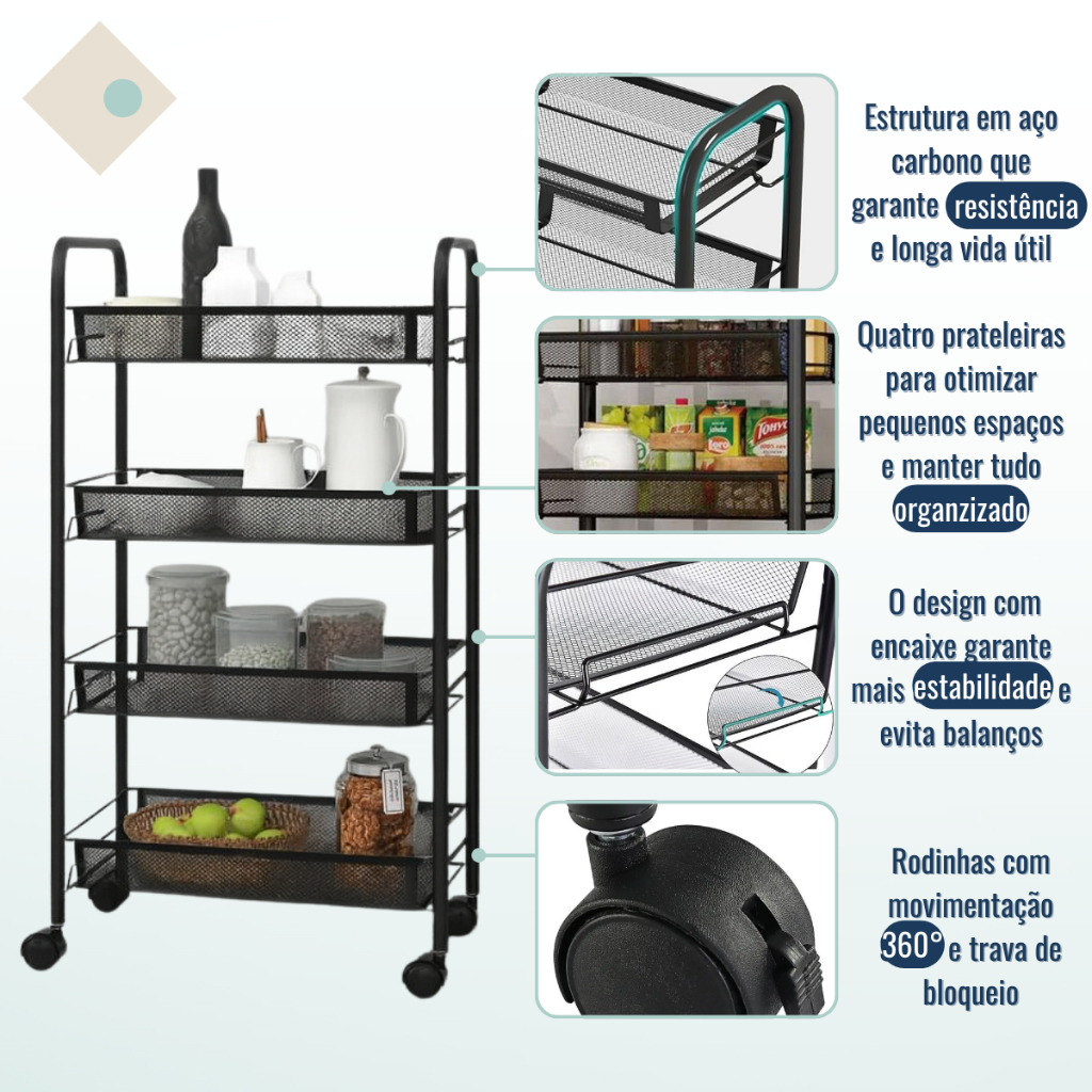 SOBRE O PRODUTO O Organizador com 4 Prateleiras é a solução ideal para quem busca praticidade, mobilidade e aproveitamento inteligente de espaço. Com um design compacto e funcional, ele permite armazenar e transportar itens domésticos em diversos ambientes, mantendo tudo sempre à mão e bem organizado. Construído em aço carbono, o organizador oferece excelente resistência e estabilidade, enquanto seus rodízios garantem deslocamento suave entre cômodos, tornando o uso ainda mais prático no dia a dia. As 4 prateleiras possibilitam um ótimo aproveitamento vertical, sendo perfeitas para cozinhas, áreas de serviço, banheiros, escritórios, despensas e outros espaços reduzidos. Benefícios do produto - Durabilidade Superior: Estrutura em aço carbono que garante resistência e longa vida útil. - Mobilidade Total: Rodinhas que facilitam o transporte e movimentação sem esforço. - Organização Inteligente: 4 prateleiras que ajudam a otimizar pequenos espaços e manter tudo em ordem. - Design Compacto: Ideal para ambientes internos e para armazenamento de carga leve a moderada. ESPECIFICAÇÕES TÉCNICAS - Dimensões do produto: 44 x 26 x 83cm - Quantidade de prateleiras: 4 - Rodinhas: Sim - Material: Aço carbono - Cor: Preta OBSERVAÇÕES - Uso indicado para ambientes internos. - Imagem meramente ilustrativa. - Todas as informações são de responsabilidade do fabricante ou fornecedor.