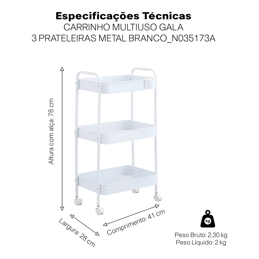 DESCRIÇÃO RESUMIDA O Carrinho Multiuso Gala 3 Prateleiras (Metal Branco, modelo N035173A) é ideal para organizar diferentes ambientes com praticidade e estilo. Com estrutura metálica resistente, três prateleiras espaçosas e rodízios, permite armazenar utensílios de cozinha, itens de limpeza ou acessórios de escritório, deslocando-se facilmente de um cômodo a outro. Características Marca: Evolux Modelo: Gala N035173A Especificações Cor Branco Tipo: Carrinho multiuso com 3 prateleiras Estrutura: Ferro metálico com pintura branca Prateleiras: Grades metálicas ventiladas Rodízios: com 4 rodas para mobilidade Material principal: Metal, Ferro pintado de branco Produto enviado desmontado; acompanha manual de montagem Ideal para: Fruteira, Porta Louças, Cantinho Do Café, Livros, Produtos DeLimpeza, Brinquedos, Fraldas, Maquiagens, Esmaltes etc. Dimensões: 82 x 42 x 33 cm (AxLxC) Conteúdo da Embalagem 1x Carrinho Gala 3 Prateleiras Metal Branco 1 x Manual de montagem e instruções Garantia 3 meses Peso 2 kg