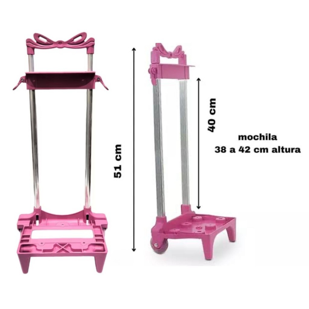 Carrinho Para Mochila Escolar Rosa 40cm Com 2 Hastes E Rodinhas De Silicone Para Menina E Menino