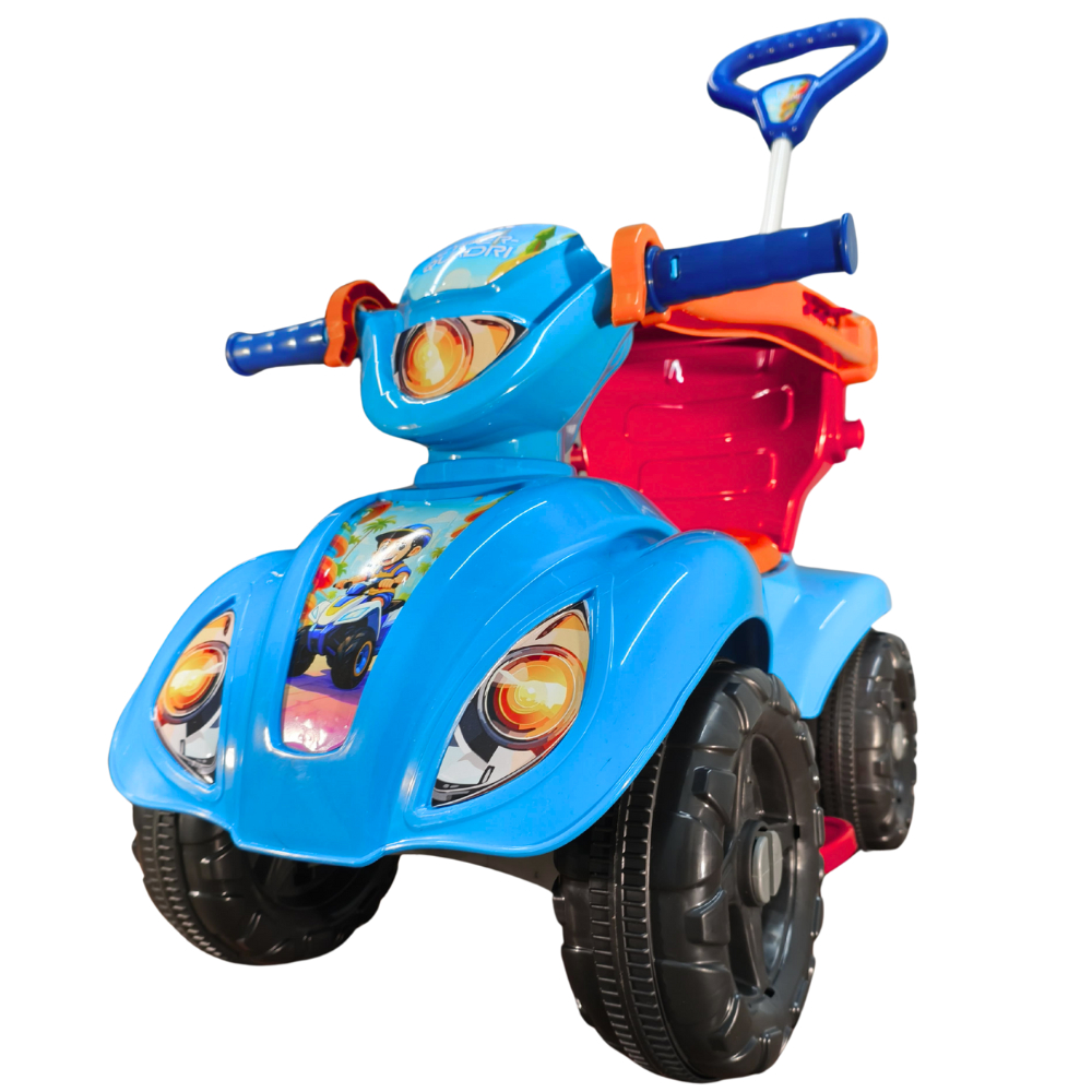 Quadriciclo Passeio Cyber Quadri Menino - Modelo Exclusivo Queen Shop Modelo com inovador com funcionalidades e ajustes para o melhor conforto da criança. - Faixa Etária: 1 a 3 anos 👶 - Capacidade de Peso: Até 30kg ⚖️ - Certificação: INMETRO Registro 009183/2024 📜 Características: - Haste de condução em alumínio reforçado (não direcionável) 💪 - Proteção lateral ajustável em 2 alturas 🔒 - Proteção interna ajustável em profundidade 🔩 - Sistema anti-tombamento para maior segurança 🚨 - Chave didática "Crec Crec" para estimular a coordenação motora 🤔 - Chocalho integrado para diversão 🎶 - Encosto ergonômico para maior conforto 😌 - Suporte para bolsas de até 10kg 🛍️ - Compartimento de objetos integrado 📦 - Peso: 4,6kg ⚖️ - Dimensões: 93cm (altura) x 68cm (comprimento) x 41cm (largura) 📏 - Dimensões da Embalagem: 36cm (altura) x 34cm (largura) x 67cm (comprimento) 📦 ATENÇÃO: VERIFIQUE AS DIMENSÕES ALTURA DO CHÃO ATÉ A PONTA DA HASTE: 93cm COMPRIMENTO: 68cm LARGURA: 41cm ALTURA SENTADO DO JOELHO ATÉ O APOIO PARA OS PÉS: 22cm PESO SUPORTADO ATÉ 30KG IDEAL PARA CRIANÇAS ATÉ: 100cm Certificação: INMETRO Registro 009183/2024 📜 Com o Quadriciclo Passeio Cyber Quadri, seu pequeno aventureiro vai se divertir muito! 😄