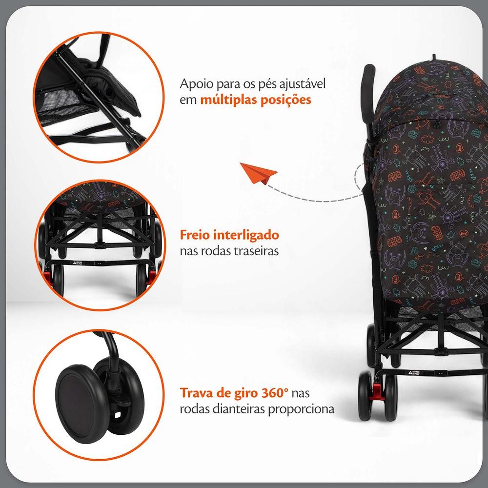 Carrinho de Bebê Pipa Voyage – Superleve, Compacto e Funcional Prático e versátil, o Carrinho Pipa é perfeito para o dia a dia. Leve e fácil de transportar, tem fechamento estilo guarda-chuva, ideal para qualquer tipo de passeio. Compacto sem abrir mão do conforto, combina com diferentes estilos de vida e acompanha a rotina das famílias com praticidade e beleza. Características: - Fechamento simples e rápido, no estilo guarda-chuva - Alça para transporte que facilita levar por onde for - Assento reclinável em 3 posições, inclusive no formato berço - Capota ampla com extensor e visor, que protege o bebê no sol e no vento - Apoio para os pés ajustável em múltiplas posições, acompanha o crescimento do bebê - As quatro rodas são duplas para oferecer mais estabilidade em qualquer terreno - Freio interligado nas rodas traseiras - Trava de giro 360° nas rodas dianteiras proporciona controle total do carrinho Especificações - Cor: Preto Neon - Fechamento: Guarda Chuva - Idade indicada: 0 a 15kg - Peso do Produto: 6,680kg - Dimensões:104 x 48 x 77,7 - Dimensões fechado: 32 x 34,5 x 105,5 - Garantia:6 meses (Garantia Padrão) + 6 meses (Garantia Estendida*) - Conteúdo da embalagem:1 carrinho, 1 manual *Aprovado pelo INMETRO conforme a norma ABNT NBR 14.389. *Registre seu produto no site da marca e ganhe garantia estendida de mais 6 meses, totalizando 1 ano. *Todos os produtos possuem Nota Fiscal Eletrônica