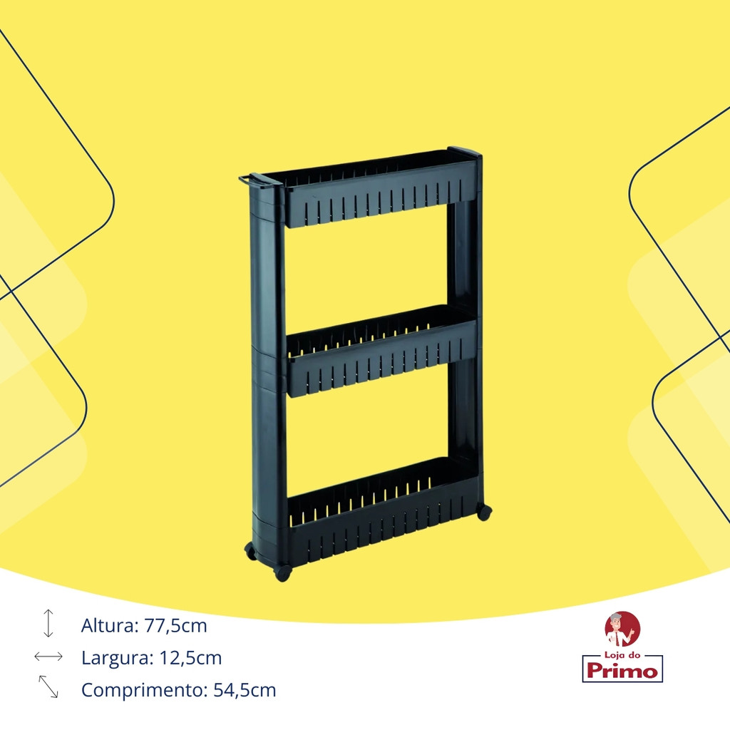 Carrinho Prateleira Multiuso com Rodízios 3 Andares Organização Cozinha Banheiro Preto Arthi