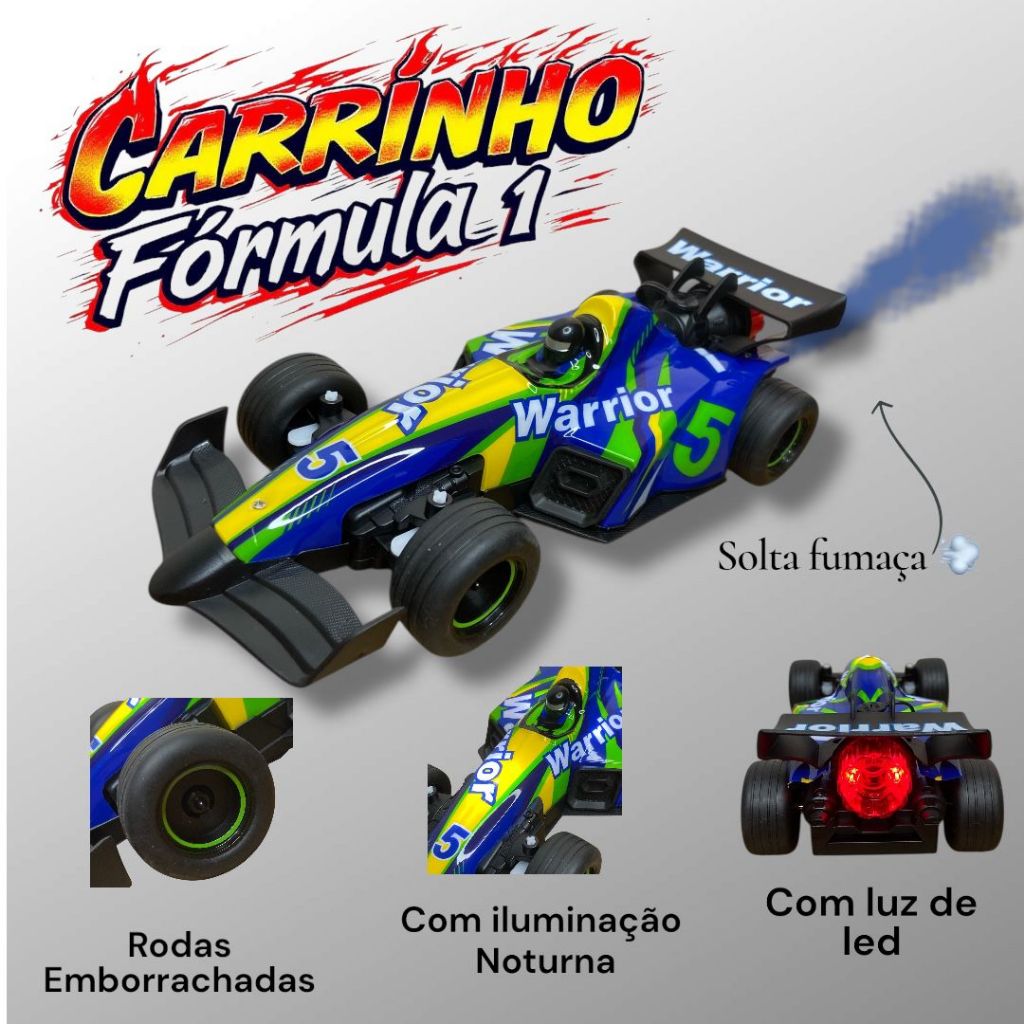 Prepare-se para surpreender seu filho com muita diversão. Transforme qualquer espaço em uma verdadeira pista de corrida com o nosso incrível Carrinho de Controle Remoto F1 Solta Fumaça. Design esportivo, cores e luzes incrivelmente vibrantes, um sistema exclusivo de fumaça realista - efeito especial que eleva a diversão a outro nível. Perfeito para quem busca adrenalina, ação e diversão sem limites! Ele combina velocidade, controle fácil e um efeito visual impressionante que encanta crianças e adultos. DETALHES DO PRODUTO - Efeito fumaça realista: Simula escapamento. Basta colocar um pouquinho de água no reservatório (tanque de água) e o carrinho solta fumaça como um carro de corrida de verdade. - Controle remoto de 40 MHz: permite movimentos precisos e fáceis. - Bateria recarregável: para muita diversão sem parar. - Luzes de LED ESPECIFICAÇÕES TÉCNICAS Escala: 1:18 Frequência: 40 MHz Funções: Frente, Ré, Direita e Esquerda Alimentação: Bateria recarregável (inclusa) Controle: utiliza 2 pilhas AA (não inclusas) Material: Plástico e sistema eletrônico Recomendado para crianças a partir de 4 anos CONTEÚDO DA EMBALAGEM: 1 Carrinho Controle Remoto F1 Solta Fumaça 1 Controle Remoto 1 Frasco de abastecimento de água 1 Bateria recarregável 1 cabo USB