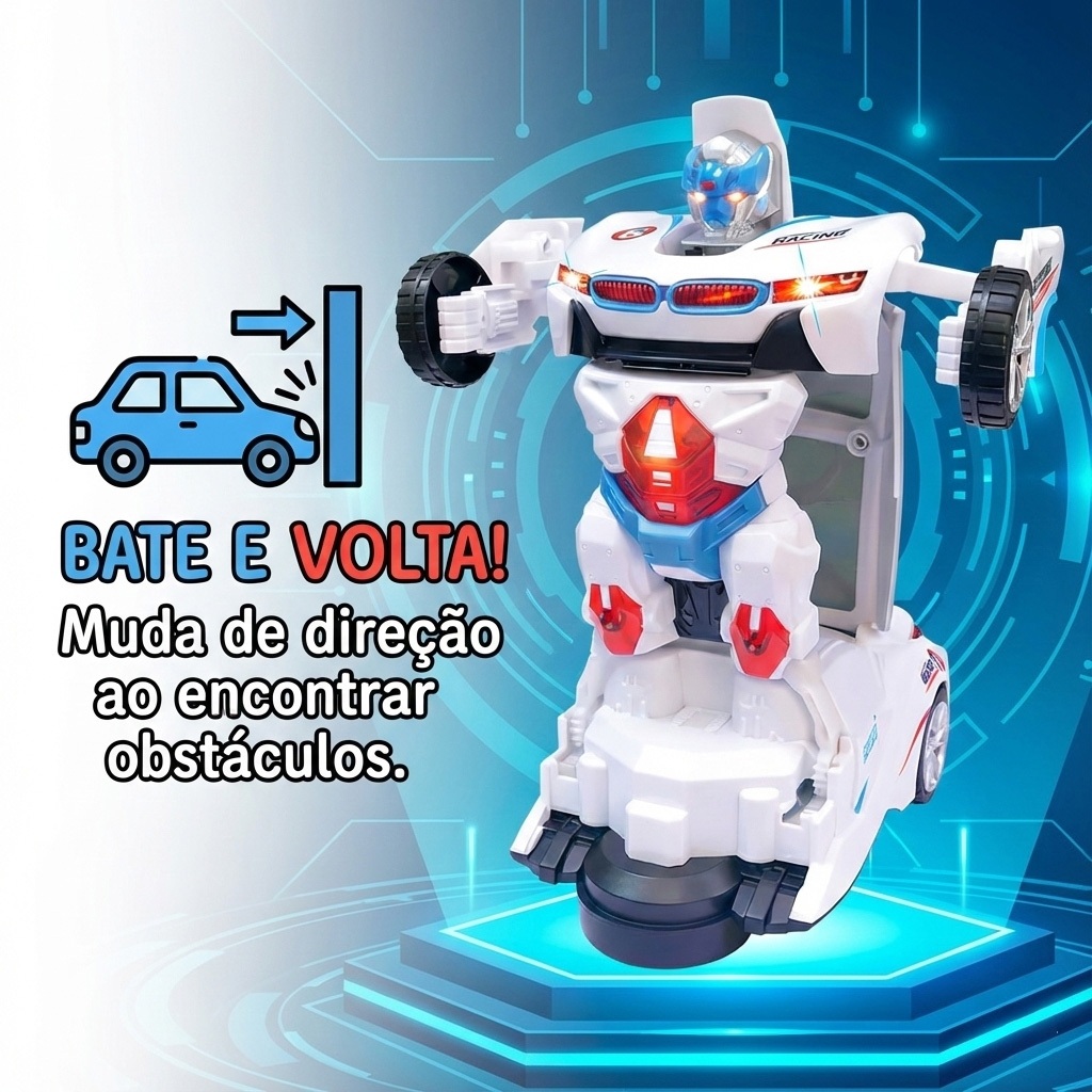 Carrinho Vira Robô Transformers Bate e Volta com Luz e Som Brinquedo Infantil Interativo Branco Carrinho Kizumba Esse incrível carrinho se transforma automaticamente em um poderoso robô em movimento, garantindo momentos de diversão e surpresa! Equipado com luzes piscantes e efeitos sonoros, ele ativa o modo "bate e volta", desviando de obstáculos e mantendo a brincadeira sem interrupções. Ideal para crianças que amam ação, velocidade e robôs, é um brinquedo que estimula a criatividade e a coordenação motora de forma interativa. Com design moderno na cor preta e visual futurista, chama atenção desde o primeiro contato. Especificações Técnicas: • Tipo: Carrinho Robô Transformers com som e luz • Transformação automática: Carro vira robô durante o movimento • Função: Bate e volta (muda de direção ao colidir) • Luzes: Coloridas em LED (frente e traseira) • Efeitos sonoros: Sons de sirene e motor • Alimentação: 3 pilhas AA (não inclusas) • Material: Plástico resistente Dimensões do Produto: • Comprimento: 23 cm • Largura: 9,5 cm • Altura: 7,5 cm FAQ (Perguntas Frequentes) 1. O carrinho funciona sem pilhas? Não. Ele precisa de 3 pilhas AA para funcionar completamente. 2. Ele transforma sozinho ou precisa apertar algum botão? A transformação é automática durante o movimento. 3. É seguro para crianças pequenas? Sim, é indicado para crianças a partir de 3 anos e possui selo do INMETRO. 4. Ele anda em linha reta? Não. A função bate e volta o faz mudar de direção sozinho ao encontrar obstáculos. Conteúdo da Embalagem: • 01 Carrinho Robô Transformers Importante: Valor Unitário Imagens meramente ilustrativas Não nos responsabilizamos pelo mau uso do produto
