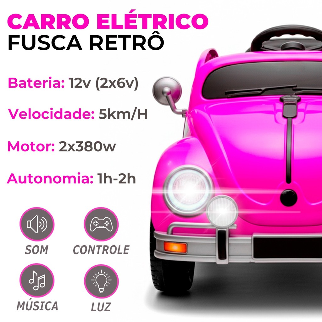 | Carro Carrinho Fusca Elétrico Motorizado 12V Rosa Veículo Para Cria... este produto | R$ 1.289,99 | — | 5.0/5 | — |