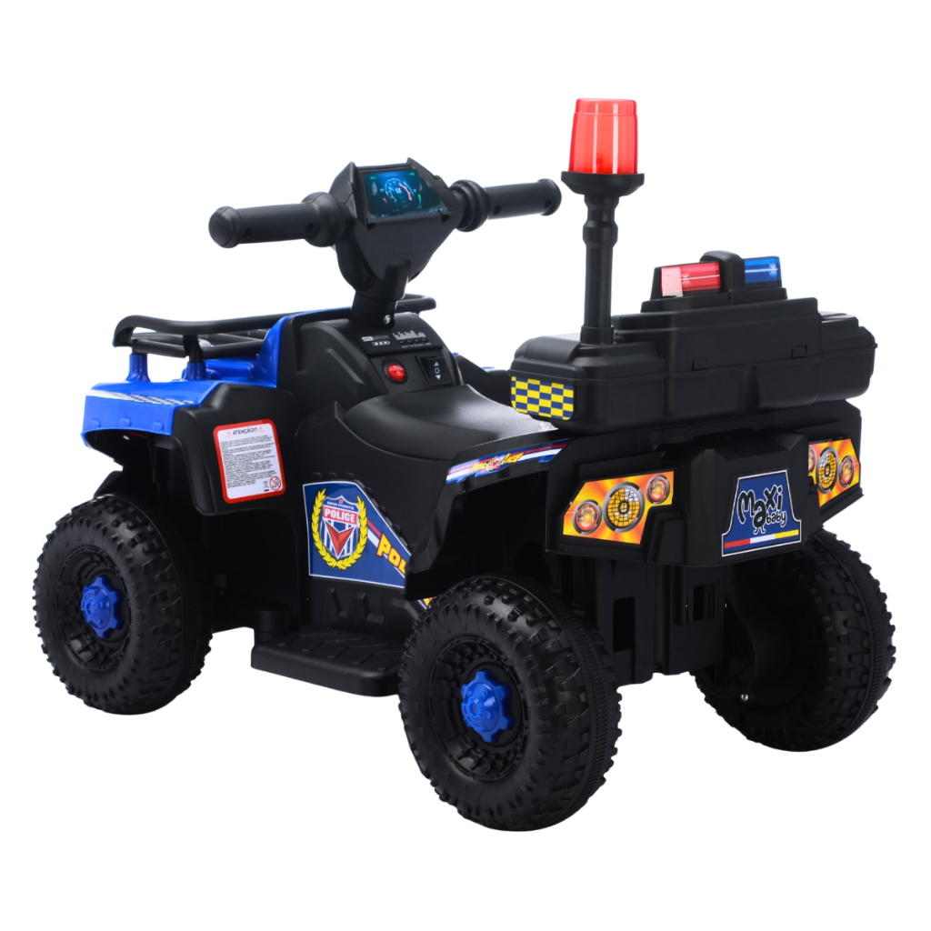Quadriciclo Elétrico Com Luzes Policial Maxi Toys O Quadriciclo Elétrico Policial Maxi Toys é muito mais do que um brinquedo: é uma verdadeira experiência de aventura para os pequenos heróis do dia a dia. Inspirado nos veículos utilizados pela polícia, ele desperta a imaginação infantil e transforma qualquer espaço em um cenário de ação e diversão. Com luzes de sirene que brilham de verdade e sons musicais integrados, o quadriciclo proporciona uma brincadeira realista e envolvente. Seu design robusto aliado à estrutura em alumínio, plástico PP e tecido PU garante resistência, conforto e durabilidade. Além disso, a bateria de longa duração assegura passeios mais divertidos, enquanto a velocidade controlada de até 5 km/h mantém a segurança em primeiro lugar. Indicado para crianças acima de 3 anos, o Quadriciclo Elétrico Policial Vermelho Maxi Toys contribui para o desenvolvimento da coordenação motora, do equilíbrio e da imaginação, proporcionando momentos inesquecíveis de lazer em família. É a escolha perfeita para quem busca um brinquedo que combina segurança, tecnologia e emoção em cada detalhe. Principais Características -ACOMPANHA CARREGADOR/FONTE BIVOLT - Indicado para crianças acima de 3 anos e até 30kgs aprox. - Condução descomplicada através de botões de frente/ré e liga/desliga. - Design policial com luzes de sirene - Pneu é alargado para proporcionar melhor aderência. - Função musical integrada - Estrutura reforçada em alumínio, plástico PP e tecido PU - Velocidade máxima de 3 a 5 km/h - DURAÇÃO DE 1 A 2HORAS APROXIMADAMENTE - Potência máxima de 12V - Estimula o desenvolvimento e a imaginação infantil - Tempo de carregamento: 8 à 10 horas - Guidão para controle da direção - Adequado para quase todos os tipos de piso, como tijolos, asfalto, piso de madeira e muito mais - Disponível nas cores: Vermelho e Azul Especificações Técnicas - Conteúdo da Embalagem: 01 Quadriciclo Elétrico Policial Maxi Toys + Manual de Instruções - Composição/Material: Alumínio, Plástico PP e Tecido PU - Alimentação: Bateria 6V41.3801 - Dimensões do Produto: 68 X 47 X 43 cm aprox. - Peso: 5,4kgs aprox. - Garantia: 90 dias (contra defeito de fabricação pelo fabricante) - Certificação INMETRO 010641/2023 / Homologação ANATEL Nº 12516-23-15907 - Código do Fabricante: 21904/ 21905 - EAN: 7899403219040/ 7899403219057 - Marca: Maxi Toys Imagens meramente ilustrativas. As cores e estampas podem variar de acordo com o lote do fabricante.
