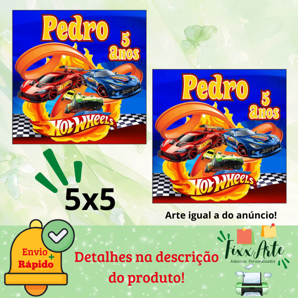 Tema: CARROS HOT WHEELS ✨PAPEL ADESIVO 115G ✨REDONDO TAMANHO 5X5 ✨ QUADRADO TAMANHO 5X5 ✨ TUBETE TAMANHO 7X3,5 OBSERVAÇÃO: Os adesivos NÃO são em 3D ✨ Personalizáveis com o nome e idade ✨ Papel adesivo com brilho e alta qualidade ✨Não alteramos, nem trocamos as medidas dos adesivos ✨Não vai Recortado IMPORTANTE: Após efetuar sua compra, enviar nome e idade; *** SE ATENTEM EM MANDAR OS NOMES E IDADE NO ATO DA COMPRA*** ***NÃO TRABALHAMOS COM PEDIDOS DE URGÊNCIA !!!***