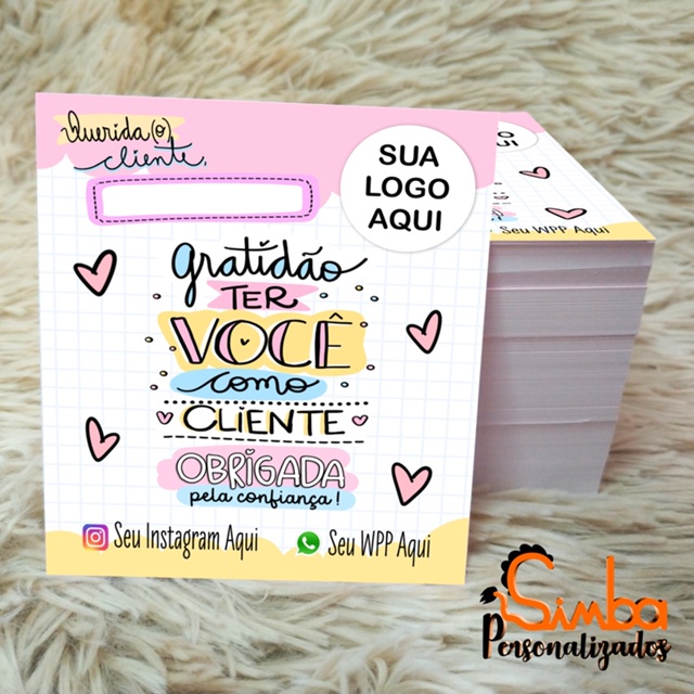 Cartão de Agradecimento Personalizado com o seu logo, wpp e insta. Enviar via chat após a compra! Não alteramos/personalizamos os outros campos do cartão, apenas acrescentamos o seu logo, wpp e insta! Não alteramos as cores dos modelos, escola um dos modelos que mais te agrade. NÃO ENVIAMOS PARA APROVAR! PRODUÇÃO E ENVIO RÁPIDO! Especificações: Quantidade:100und Tamanho: 10x9cm, podendo haver variação de até 2mm. Material: Papel Offset 180g - Fosco sem brilho Impressão com tinta Pigmentada ***FOTO/MOCKUP ILUSTRATIVA DE 300und!!!*** -> Não nos responsabilizamos por legibilidade de logo de cliente. O logo é apenas acrescentado não conseguimos fazer alterações nos logotipos. Caso haja diferenças entre impressão/e monitor e celulares, pois são processos diferentes. Pois um é RGB e outro é CMYK. Sempre haverá diferenças de tonalidades.