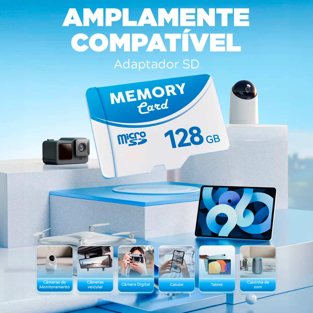 Cartão de Memória Micro SD 128GB – Versatilidade e Alto Desempenho Este cartão de memória Micro SD de 128GB oferece a solução perfeita para ampliar o armazenamento do seu dispositivo. Ideal para smartphones, câmeras, tablets, drones e outros dispositivos compatíveis, ele é projetado para oferecer alta velocidade de leitura e gravação, garantindo desempenho estável e confiável. Perfeito para armazenar fotos, vídeos, músicas, apps e muito mais. Compacto e durável, é resistente a água, choques, temperaturas extremas e raios X. Especificações Técnicas: Capacidade: 128GB Velocidade: Classe 10 (alta taxa de transferência) Compatibilidade: Compatível com dispositivos que possuem slot Micro SD Durabilidade: Resistente a água, temperaturas extremas, raios X e choques Velocidade de leitura: até 100MB/s (pode variar conforme o dispositivo) Perguntas Frequentes (FAQ): Este cartão é compatível com meu celular ou câmera? Verifique se o seu dispositivo possui suporte para cartões Micro SD de até 128GB. A maioria dos dispositivos modernos é compatível, mas é sempre bom confirmar no manual do fabricante. Posso usar este cartão para gravar vídeos em Full HD ou 4K? Sim, este cartão é Classe 10 e possui velocidade suficiente para gravações em Full HD. Para gravar vídeos em 4K, recomenda-se verificar os requisitos do equipamento, pois o desempenho pode variar. O cartão acompanha adaptador para SD? Sim, o cartão pode vir com um adaptador para você utilizá-lo em dispositivos que suportam apenas cartões SD tradicionais. Verifique o conteúdo do pacote no momento da compra. É resistente a condições extremas? Sim, o cartão é projetado para suportar água, temperaturas negativas e elevadas, raios X de aeroportos e quedas ocasionais. Observação: Antes de adquirir, certifique-se de que o dispositivo seja compatível com o formato Micro SD e a capacidade de 128GB. Evite sobrecarga ou desgaste inadequado para manter a durabilidade e o desempenho do cartão de memória. Se precisar de mais informações, entre em contato!