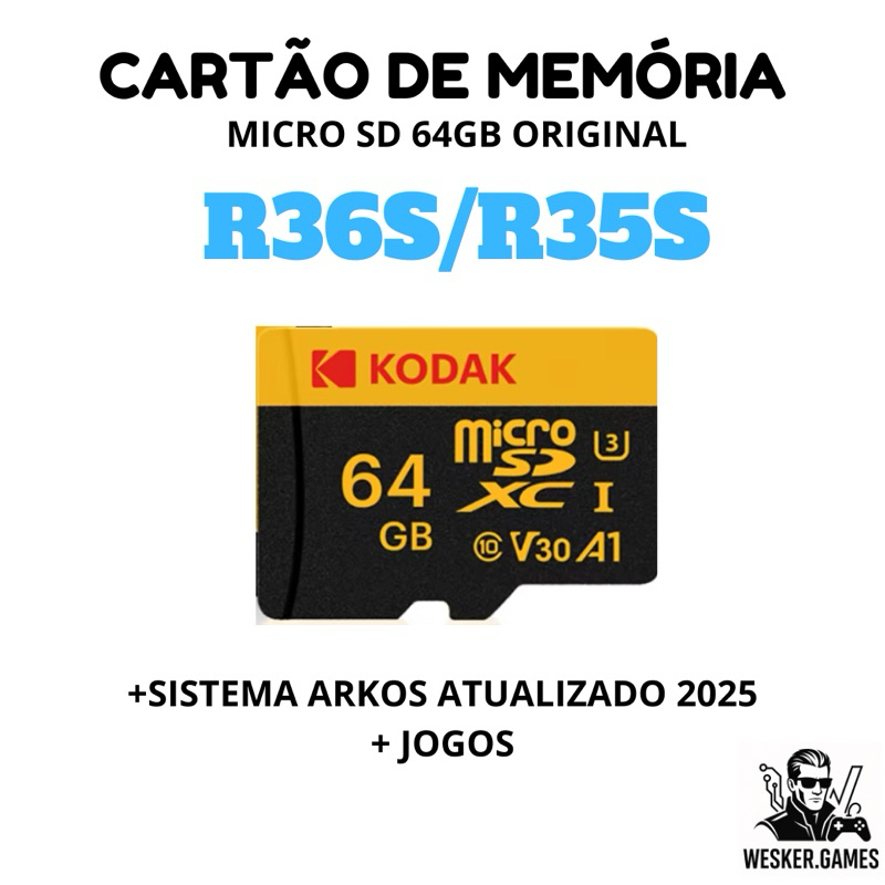Cartão de Memória Micro SD 64GB Original Com Sistema ArkOS Última versão 2025 + Jogos P/Portátil R35s e R36s