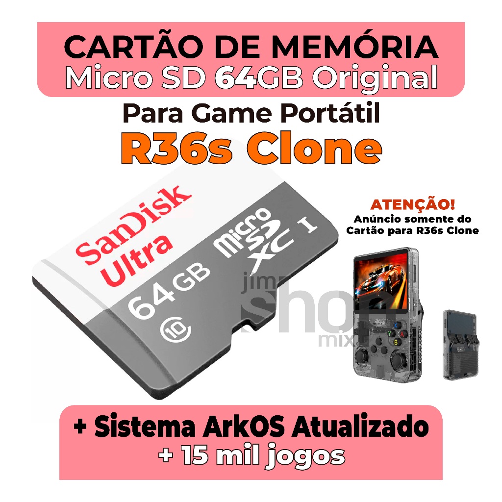 PRODUTO NO BRASIL COM ENVIO IMEDIATO!!! POR FAVOR: PARA QUE O CARTÃO SEJA ENVIADO CORRETAMENTE; É MUITO IMPORTANTE INFORMAR QUAL A VERSÃO DA PLACA DO APARELHO. - Abra a tampa onde fica a bateria, levanta-a, e veja o código que está na placa e compara com a imagem do anúncio. (O código fica na placa, não na bateria); se o aparelho não for o transparente; será preciso abri-lo por completo. Mas fique tranquilo, muito fácil de abrir. IMPORTANTE: Alguns clones tem painéis diferente; por padão, enviamos com o Painel Tipo 4 - O mais usado. Caso o painel do seu aparelho seja diferente e precisar de ajuda; enviamos junto um folheto com nosso suporte. - Enviamos já com o EFOOTBALL 2026, Sonic Adventure 2; - Enviamos também com os Ports; Stardew Valley, Gta 3, Counter Stike e Minecraft e muito mais. - Enviamos também com cerca de 130 jogos de Pico-8. Enviamos o cartão já com o Emulador de PSP Configurado e prontinho para os jogos de God of War - Chains of Olympus e God of War - Ghost of Sparta. (Acompanha os dois jogos). - Marca: SanDisk, Tomate ou H'Maston, todos originais - Cartão Micro SD + Adaptador - Com Jogos de: PSP, PS1, PORTS, PICO8, NG, GG, DC, MD, NDS, GBA, GBC, GB, N64, SNESS, NES, SF, entre outros. Conteúdo da Embalagem: 1x Cartão Micro SD Com Sistema ArkOS Atualizado; Compatível com: Game Console R36s Clones NOTA: O cartão de 64GB ou de 128GB, ambos têm praticamente as mesmas quantidades de jogos. A diferença, portanto, é no espaço livre para adicionar seu jogo favorito quando quiser.