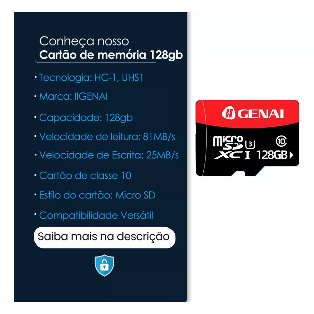 ✨✨Usamos materiais de alta qualidade, você recebe o que pagou e nosso erro de memória não excederá 3-5 GB! ✨✨Cartão de Memória Micro SD iiGenai 32/64/128GB - Armazenamento Seguro e Velocidade Superior ✅O Cartão de Memória Micro SD iiGenai é a escolha ideal para quem busca armazenamento confiável e alta velocidade de transferência de dados. Com tecnologia HC-1 UHS1 (Ultra High Speed), este cartão classe 10 oferece uma velocidade estável e segura de gravação, garantindo o desempenho necessário para suas necessidades de armazenamento. ✅-Velocidade e Desempenho Superior: Com velocidade de leitura de até 81MB/s e velocidade de escrita de até 25MB/s, este cartão proporciona uma experiência de uso fluida e rápida, seja para capturar fotos e vídeos em alta resolução ou para transferir arquivos de forma eficiente. ✅-Compatibilidade Versátil: Este cartão de memória pode ser usado em uma variedade de dispositivos, incluindo drones, câmeras de vigilância, smartphones, câmeras fotográficas e muito mais, garantindo uma solução de armazenamento confiável em diferentes cenários. Recursos Adicionais: ✅-Segurança e Estabilidade: A tecnologia HC-1 UHS1 assegura uma gravação estável e segura de dados, protegendo suas informações importantes contra perdas ou danos na transferência. ✅-Ampla Capacidade: Com 32/64/128GB de capacidade de armazenamento, este cartão oferece espaço suficiente para guardar uma grande quantidade de fotos, vídeos, músicas e outros arquivos digitais. ✨✨Detalhes Técnicos: -Tecnologia: HC-1, UHS1 (Ultra High Speed) -Capacidade: 32/64/128GB -Velocidade de Leitura: 81MB/s -Velocidade de Escrita: 25MB/s -Classe: 10