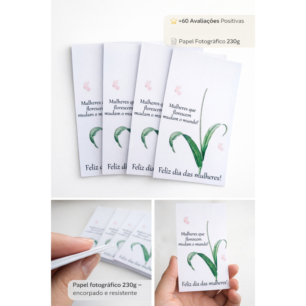 Descrição do Produto: MANDE A FRASE JUNTO COM O PEDIDO. ⚠️ Caso a frase não seja enviada após a compra, o produto será enviado sem personalização. Cartões delicados para lembrancinhas de diversas ocasiões 💕 Perfeitos para acompanhar doces, caixinhas, lembranças e presentinhos de aniversário, chá de bebê, batizado e muito mais! *coloco sua logo, com fundo branco. sem detalhes colorido ✨ Detalhes do produto: NÃO ACOMPANHA A FLOR, APENAS O CARTÃO Modelo: Cartão/Tag Frase: Você escolhe no ato da compra pelo chat, frase curta. Material: Papel fotográfico 230g premium Tamanho aproximado: 15 cm x 8 cm Impressão alta definição Cores vibrantes Corte profissional Ideal para surpreender Acabamento: Cantos retos 💡 Dica: Você pode prender junto um mimo como presilha de flor, bombom, chaveiro ou lembrancinha da sua escolha. Vantagens: 🎁 Ideal para: ✔️ Lembrancinhas de aniversário ✔️ Chá de bebê / chá revelação ✔️ Batizado ✔️ Nascimento ✔️ cliente Como usar: Use como cartão para entregar sozinho Fixe uma presilha de flor ou bombom para dar um toque especial Perfeito para lembranças, agradecimentos para suas clientes. Cartão Natal, Cartão Natal para as clientes