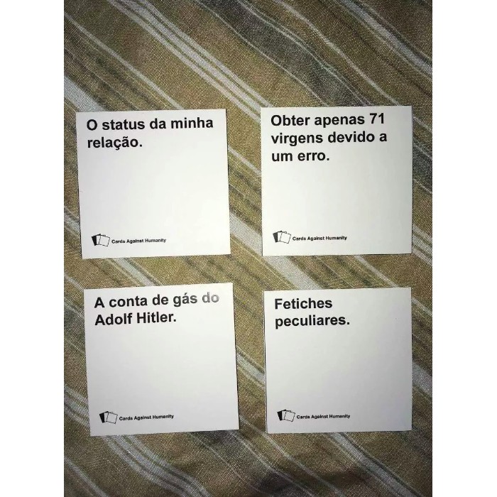 Jogo novo traduzido para português. O objetivo é fazer combinações de perguntas e respostas que cria várias frases engraçadas, e sim, nesse jogo tem vencedor. 400 cartas de respostas 102 cartas de perguntas *Não acompanha caixa.* Versão com corte tem caixa de mdf de brinde (pode descolar durante o envio, devido a impactos, basta apenas usar cola branca comum para arrumar). Versão sem corte vai apenas as cartas impressas para o comprador cortar. (conferir disponibilidade da caixa de brinde) Cartas em branco (personalizáveis para escrever a frase que desejar) podem ser enviadas de forma aleatória como brinde. Feito em papel couchê gramatura 250 -> 210g a 300g — essa faixa é usada para cartões de visita, convites, cartões-postais, cartões de aniversário, capas de livros, calendários e outros impressos que exigem mais resistência e durabilidade;