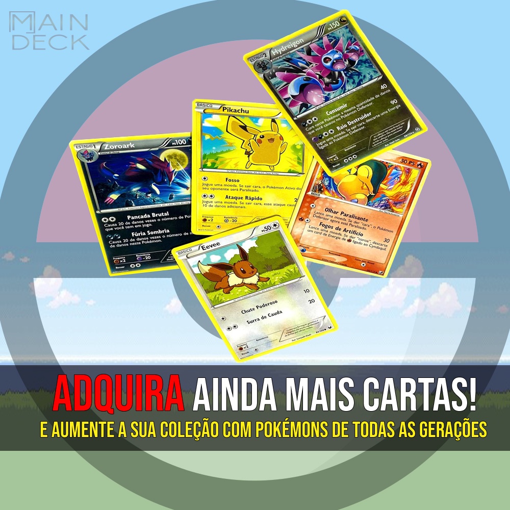 O lote contendo 50 cartas acompanha de brinde 2 cartas foil (brilhantes) garantidas. O lote contendo 30 cartas acompanha de brinde 1 cartas foil (brilhantes) garantidas. O Lote possui cartas aleatórias de pokémons de todas as gerações e tipos. Essa é a sua chance de conseguir cartas raras e originais, que contam com o que há de melhor em qualidade de papel e impressão por se tratar de um produto oficial, distribuído e fabricado pela Copag com a autorização da Pokémon Company. Todas as cartas do lote são em português e inglês, aleatórias, não sendo possível alterar qualquer pacote.