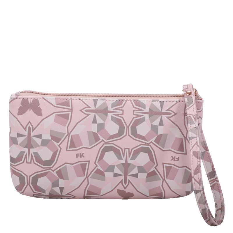 Carteira Almoço com Estampa de Borboletas, abertura em zíper e compartimentos internos para cartões.