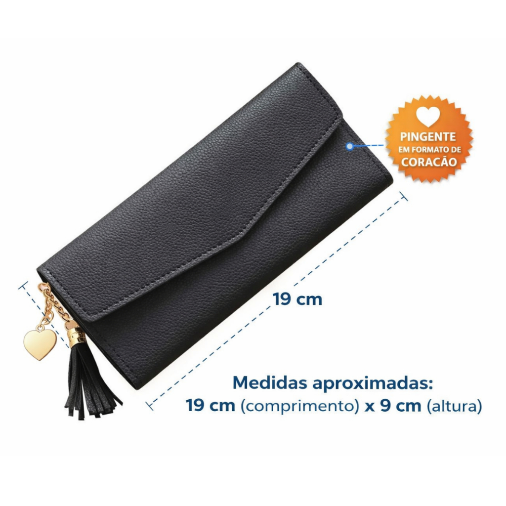 A carteira feminina envelope com zíper e pingente, elegante e versátil, ideal para mulheres que buscam praticidade e estilo no dia a dia. Um acessório indispensável para compor o look e manter documentos, dinheiro e cartões sempre organizados. Afinal, com design moderno no formato envelope, a carteira conta com acabamento sofisticado e fechamento em botão de pressão, perfeito para combinar com qualquer estilo. O detalhe do pingente com coração dá um toque charmoso e delicado ao acessório. Características que Fazem a Diferença: Material: Couro sintético de alta qualidade Modelo: Carteira envelope feminina Fechamento: Botão de pressão e zíper interno Pingente decorativo com coração e borla Compartimentos internos para: Cartões Dinheiro (notas e moedas) Documentos Medidas aproximadas: 19 cm (comprimento) x 9 cm (altura) Leve, prática e resistente Estilo elegante, ideal para uso diário ou graças especiais Especificações: Material: Couro sintético Medidas Aproximadas: 19 cm x 9 cm