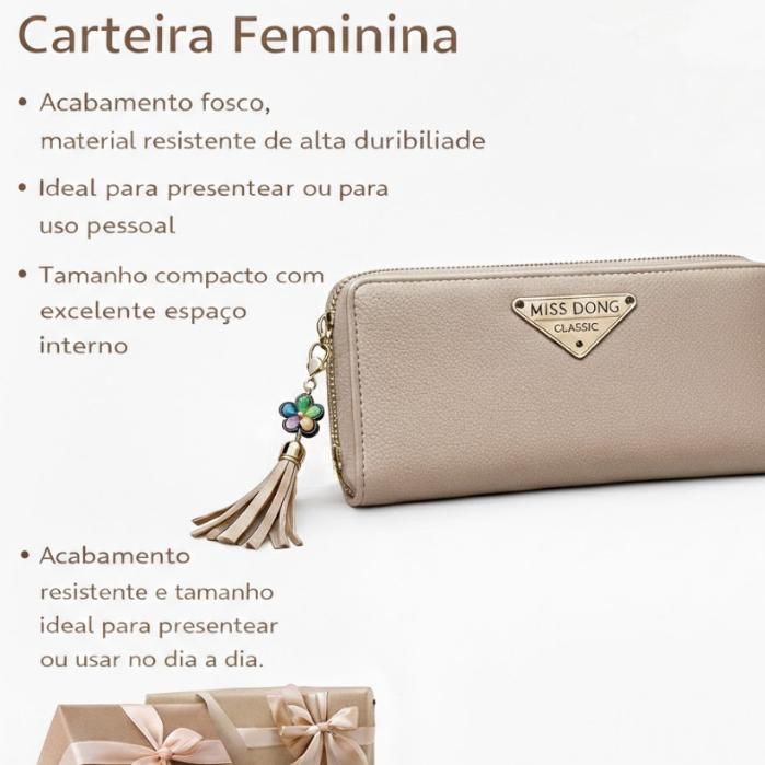 👜 Carteira Feminina Miss Dong – Elegância e Funcionalidade no Seu Dia a Dia Se você busca praticidade, estilo e qualidade, essa carteira é perfeita para você! 💖 Produzida em couro sintético de alta qualidade, ela possui acabamento fosco sofisticado e excelente durabilidade. 📏 Dimensões: 20 cm x 10 cm x 2 cm 📦 Material: Couro sintético resistente e de alta qualidade ✨ Destaques do Produto: ✔ Material resistente e durável ✔ Tamanho compacto, ideal para bolsas médias e grandes ✔ Excelente espaço interno para organizar cartões, dinheiro e documentos ✔ Fechamento seguro com zíper ✔ Detalhe delicado com pingente e tassel, trazendo mais charme 🎁 Ideal para presentear ou para uso pessoal. Perfeita para o dia a dia, trabalho, passeios ou viagens. Disponível em várias cores para você escolher a sua favorita! 💕 Produto moderno, funcional e com ótimo custo-benefício.