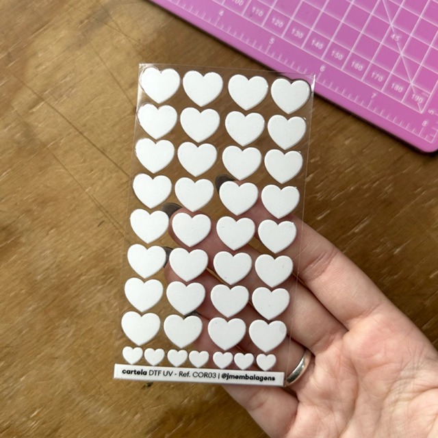 Cartela Adesivo DTF UV - Mini Corações Cor: Branco Ref. COR03 - 1, 2, 3, 4 ou 5 cartelas