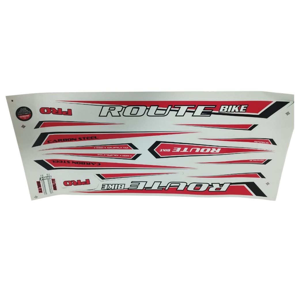 Cartela de Adesivos Bicicleta Marca Route Bike - Quadro Aro 29 !! Jogo completo para uma bicicleta !! ____________________________________________ Òtima qualidade. Material Vinil. Fácil de colar. Preço referente a uma cartela de adesivo. * Dica para uma boa aplicação. Limpe o local com um pano e alcool, certifique-se de retirar todo o pó e oleosidade para melhor fixação do produto