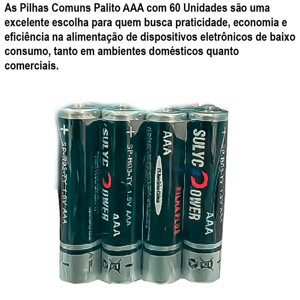 COMERCIAL VIPASA DISTRIBUIDORA.Cartela De Pilha Palito 2AA Ou 3AAA 1,5V De Alta Qualidade Para Controles Brinquedos E Muito MaisTipo: Pilha ComumFormato: Pilha Palito AAA (Triple A)Quantidade: Pacote com 60 unidadesUso: Diversos dispositivos eletrônicos de baixo consumoDetalhes do Produto:Tamanho: AAA, também conhecida como pilha palito.Tensão: 1.5V, ideal para alimentar uma ampla variedade de dispositivos.Composição: Livre de mercúrio e cádmio, sendo mais seguras e ecológicas.Embalagem: Pacote econômico com 60 pilhas, facilitando o armazenamento e a reposição.Aplicações:Eletrônicos de Baixo Consumo: Perfeitas para controles remotos, relógios, lanternas, brinquedos, calculadoras, e outros pequenos aparelhos eletrônicos.Uso Doméstico e Comercial: Ideal para residências, escritórios, escolas e outros estabelecimentos que utilizam dispositivos alimentados por pilhas AAA.Reabastecimento de Estoque: Excelente opção para reabastecer estoques de lojas, empresas e outros negócios que vendem ou utilizam pilhas regularmente.Benefícios:Economia: Comprar em atacado proporciona um custo-benefício melhor, reduzindo o custo por unidade.Praticidade: Ter um estoque de 60 pilhas garante que você sempre terá pilhas à mão quando precisar, evitando interrupções no uso de dispositivos.Confiabilidade: Pilhas de alta qualidade, oferecendo desempenho consistente e duradouro.Observações:Armazenamento: Manter em local seco e fresco para garantir a durabilidade e a eficiência das pilhas.Descarte: Descartar corretamente as pilhas usadas em pontos de coleta específicos para reciclagem, contribuindo para a preservação do meio ambiente.Validade: Verificar a data de validade indicada na embalagem para garantir o uso dentro do período recomendado.Informações Adicionais:Segurança: Manter fora do alcance de crianças para evitar ingestão acidental.Compatibilidade: Certifique-se de que os dispositivos são compatíveis com pilhas AAA antes de usá-las.As Pilhas Comuns Palito AAA com 60 Unidades são uma excelente escolha para quem busca praticidade, economia e eficiência na alimentação de dispositivos eletrônicos de baixo consumo, tanto em ambientes domésticos quanto comerciais.COMERCIAL VIPASA DISTRIBUIDORA.