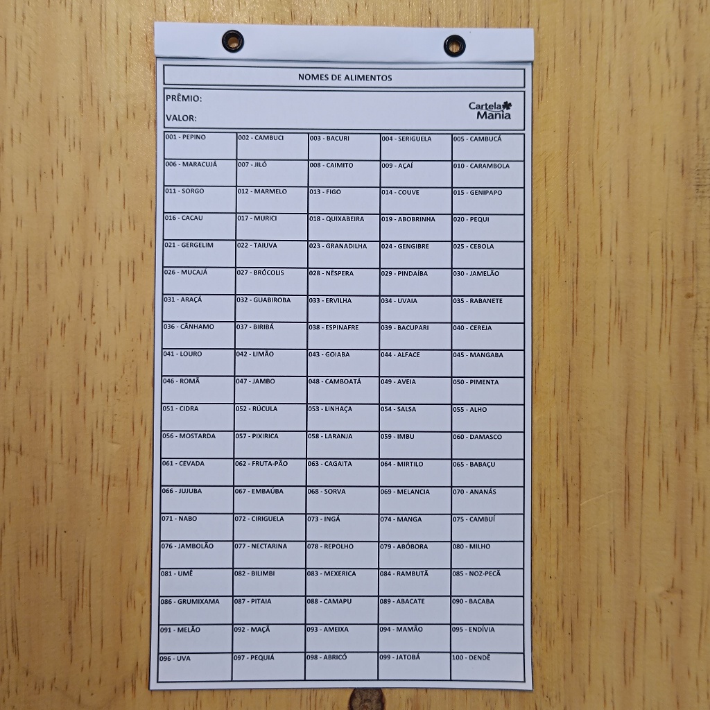 | Cartela de Rifa 100 Itens - Números, Alimentos, Animais, Cidades, P... este produto | R$ 19,49 | — | 4.8/5 | — |
