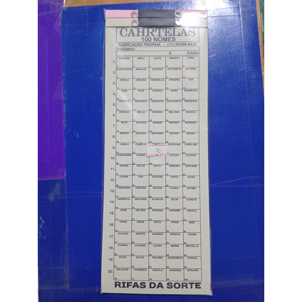 CARTELA DE RIFA 100 NOMES, FRENTE ÚNICA, PCT COM 10 UNIDADES