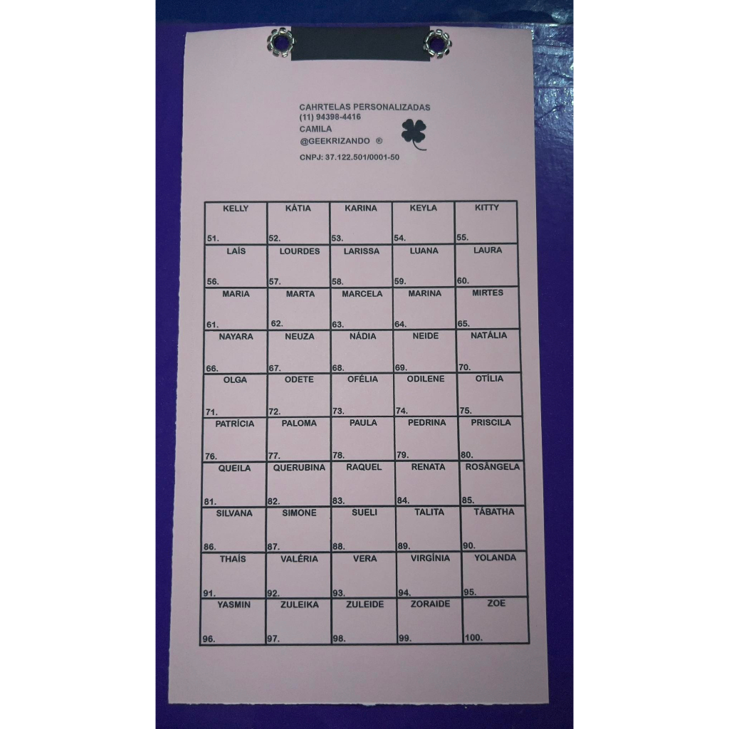 CARTELA DE RIFA 100 NOMES PCT COM 10 UNIDADES