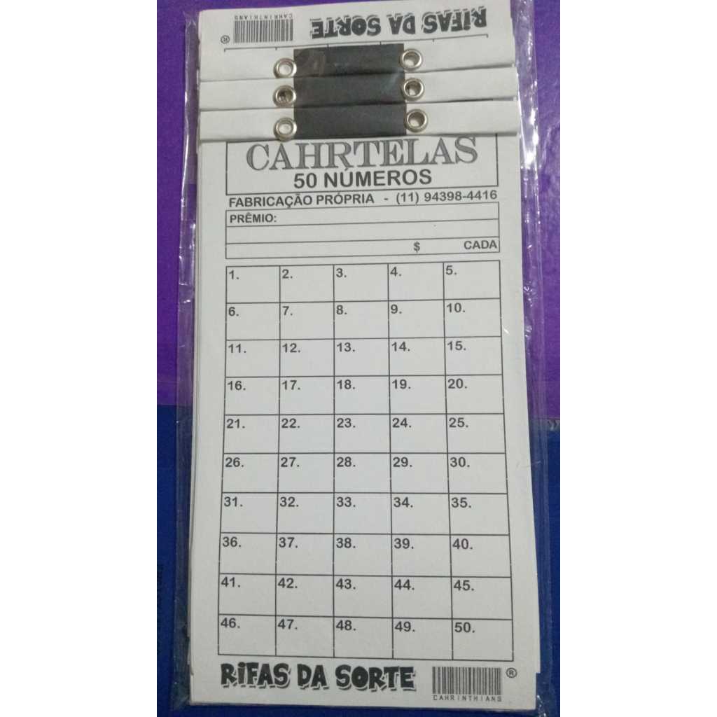 CARTELA DE RIFA 50 NÚMEROS, PACOTE COM 10 UNIDADES