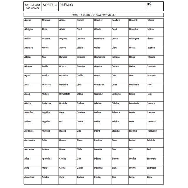 | Cartela de RIFA com 200 Nomes Cartela da Sorte | R$ 11,00 | — | 5.0/5 | 7 |