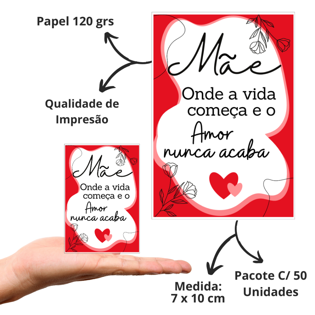 Cartões Agradecimento - Dia das Mães - Tam: 7 x 10 cm ✅Sobre o produto: ✔ Quantidade: 50 unidades ou 100 Unidades ✔ Medida: 7 x 10 cm ✔ Material: Papel 120 grs ✔ Acabamento: total frente ✔ Impressão: Frente ✔ Sem Furo ✅Diferencial do nosso Produto: ✔ Pronta entrega ✔ Alta qualidade de impressão ✔ Material resistente ✔ Fácil de usar ✔ Enviamos para todo o Brasil 🚚 Envio Super Rápido 🥰 Para dúvidas, estamos à disposição no chat
