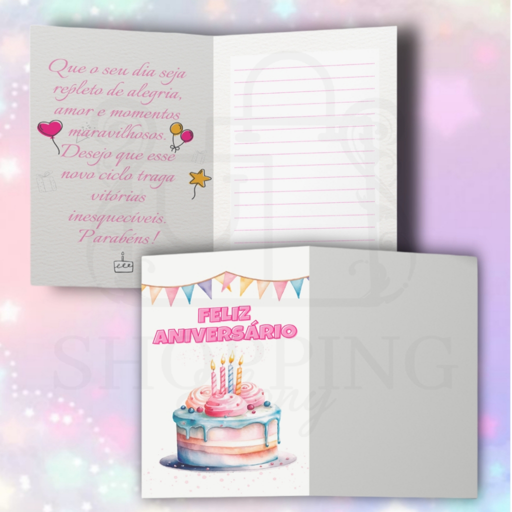 ♡ Cartão Feliz Aniversário ♡ Especificações: Medidas do Cartão fechado •Altura Aproximadamente 14cm •Largura Aproximadamente 10cm •Impressão frente e verso •Cartão dobrado •Papel Brilho 180g ( Dentro do cartão tem uma mensagem e espaço para escrever uma dedicatória ao aniversariante ) Os Cartões não acompanham envelope Impressão de alta qualidade Garantias •Poderá ocorrer variação de 10 a 15% na cor e intensidade, de acordo com o monitor ou tela que a imagem do produtos estiver exibida. Não caracterizando defeito de impressão. •Produtos de materiais e acabamentos diferentes, podem apresentar variação de cores entre si. •Todos os produtos são avaliados e revisados antes do envio para entregar o melhor para os nossos clientes. •Atenção ao escolher a variação do anúncio• •Qualquer duvida estamos a disposição.