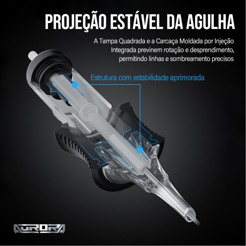 Cartucho de tatuagem AURORA GEN III Registro ANVISA nº: 82209839003 | Seguro e Higienizado 01 CAIXA CONTÉM 16 UNIDADES UNIVERSAL TAMANHO: 12 (35mm) *NÃO TRABALHAMOS COM TAMANHO 10, POR GENTILEZA SE ATENTAR A ISSO* Linha de produção padronizada para garantir que cada agulha seja feita com precisão, tornando cada agulha a melhor que precisa Aço inoxidável 316 premium, maior dureza e mais afiado. ***INDICAÇÕES E INTRUÇÕES***: CM = RM (MAGNUM CURVADA) M1 = MG (MAGNUM TRAÇADA / MAGNUM RETA) --- Agulha RM ou CM (Magnum Curvada): Possui diversas agulhas soldadas entre si de forma curvada, é recomendada para sombreamento mais suaves, preenchimentos coloridos e aplicação de detalhes. Por ter este formato ela realiza o preenchimento sem marcar, deixando o desenho mais homogêneo. --- Agulha RL: As agulhas RL são as mais utilizadas pelos tatuadores de todos os estilos. Essas agulhas são soldadas cerca de 3mm antes da ponta da agulha. A quantidade de agulhas define que tipo de traço será realizado (superfina, fina, grossa ou preenchimento). SUPER UTILIZADA PARA TATUAGEM FINE LINE --- Agulha RS: O modelo RS possui as agulhas soldadas em cerca de 5 a 6 mm da ponta. Elas possuem o mesmo formato das agulhas RL somente sendo mais abertas. São perfeitas para pintura e sombreamento mais leves. São bastante utilizadas para o estilo Bold Line por serem mais suaves na hora do preenchimento. --- Agulha M1 ou MG (Magnum Traçada): Por conta do formato, ele enfrenta uma menor resistência na pele, por isso é mais utilizada para pinturas mais sólidas e pesadas. O Taper médio, geralmente é utilizado para colorir, por permitir maior contato das agulhas com a pele. O Taper longo é utilizado para trabalhos Preto e Cinza, por permitir mais tempo na pele para um preenchimento controlado.