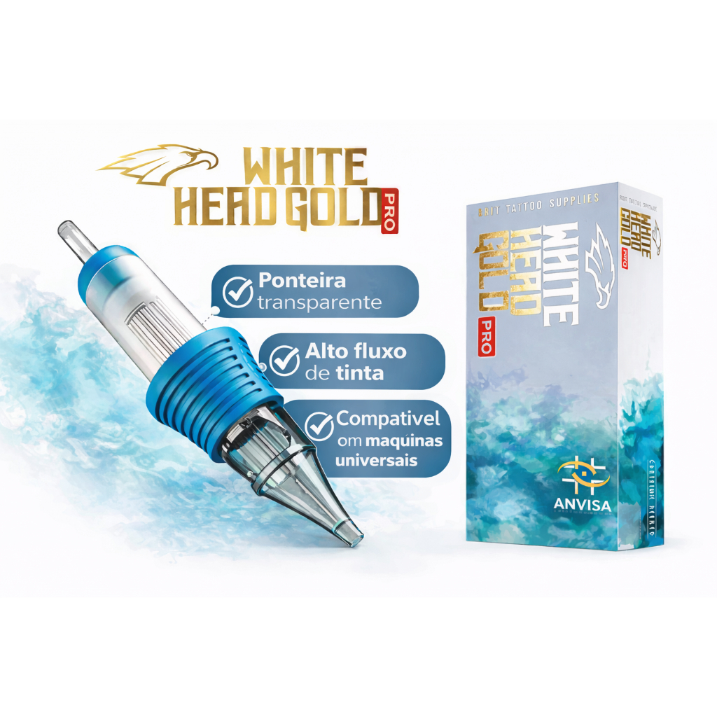 Cartucho White Head Pro O Cartucho White Head Pro é desenvolvido para tatuadores profissionais que buscam precisão, segurança e alto desempenho em todos os estilos de trabalho. Produzido com materiais de alta qualidade e sistema de membrana avançado, garante traços mais limpos, fluxo constante de tinta e maior controle durante a aplicação. Ideal para linhas, sombreamentos e preenchimentos, é compatível com as principais máquinas do tipo Pen do mercado, oferecendo encaixe perfeito e estabilidade durante o uso. Principais Características • Cartuchos descartáveis de uso único • Sistema de membrana de segurança anti-refluxo • Fluxo de tinta contínuo e estável • Alta precisão e controle de traço • Menor vibração e maior conforto ao tatuar • Encaixe universal para máquinas tipo Pen Especificações Técnicas • Marca: White Head • Linha: Pro • Quantidade: 20 unidades por caixa • Tipo de produto: Cartucho para tatuagem • Material da agulha: Aço inoxidável cirúrgico • Corpo do cartucho: Plástico de grau médico • Esterilização: Óxido de Etileno (EO) • Embalagem: Individual e lacrada • Uso: Profissional Modelos Disponíveis (variações) Disponível em diversos formatos, conforme escolha na variação: • RL – Round Liner (traço) • RS – Round Shader (sombra) • RM – Magnum Curved (pintura) • M1 / Magnum (preenchimento) • Fine Line (traço extra fino) Compatibilidade Compatível com máquinas de tatuagem do tipo Pen que utilizam sistema de cartucho universal. Benefícios para o Profissional • Maior segurança e higiene • Menos desperdício de tinta • Melhor cicatrização da pele • Resultado mais preciso e profissional • Agulhas afiadas e alinhadas de fábrica Conteúdo da Embalagem (escolha a quantidade que te atende na variaçao) • 01 Caixa com 20 cartuchos White Head Pro (mesmo modelo) • 01 Blister com 5 Unidades •. 02 Blister com 5 Unidades total 10 unidades Indicado Para • Tatuagem artística • Micropigmentação • Microagulhamento Informações Importantes Produto descartável de uso único. Não reutilizar. Uso exclusivo por profissionais habilitados. Verifique o modelo selecionado antes da compra.