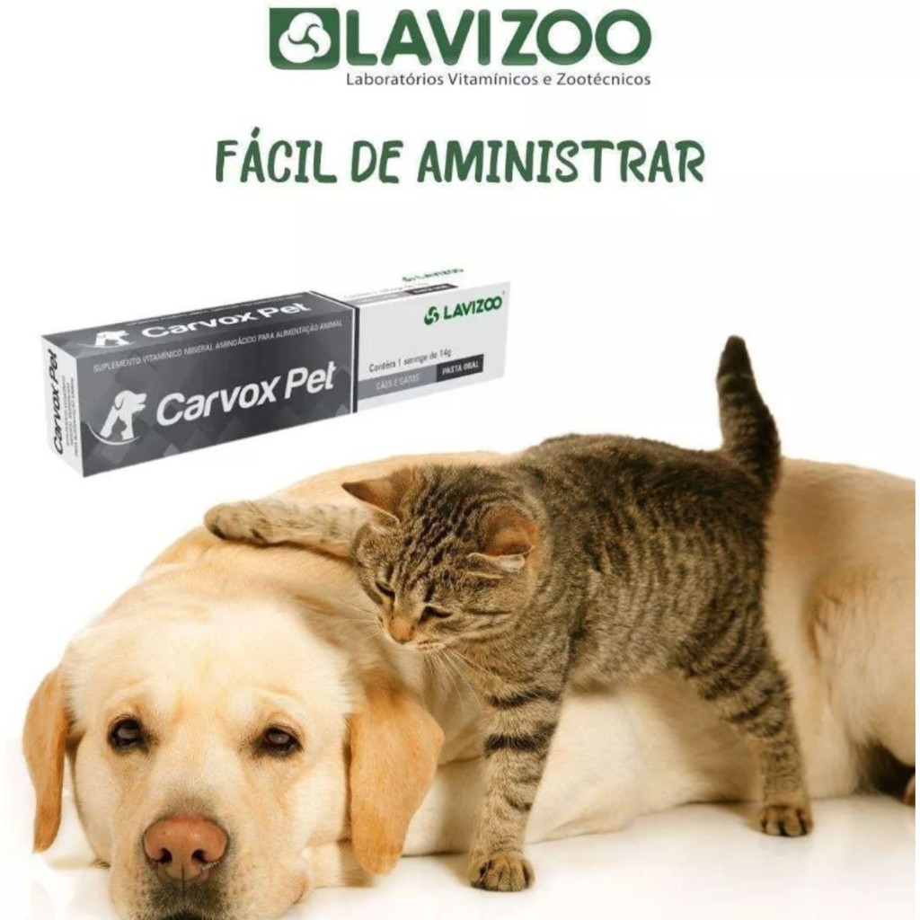 A MANADA ANIMAL é um marketplace de produtos veterinários. É a escolha certa para tutores que prezam pela qualidade dos produtos que seu animal necessita. Tudo com o suporte de uma equipe de veterinários e gestores com mais de 10 anos de experiência no mercado. Fique tranquilo, todos os nossos produtos são originais, adquiridos através de distribuidores credenciados! Ah, e todas as vendas acompanham nota fiscal! MANADA ANIMAL, Tranquilidade pra você, cuidado para ele! ______________________________________ Carvox Pet O Carvox Pet é um suplemento vitamínico mineral aminoácido para cães e gatos. Apresentado em prática forma de pasta, o Carvox Pet tem fácil administração e rápida absorção no organismo animal, proporcionando ação imediata. Sua embalagem é uma bisnaga dosadora, facilitando a aplicação. USO EXCLUSIVO NA ALIMENTAÇÃO ANIMAL. Apresentação Cartucho com seringa dosadora com 14g. Modo de uso Dose por aplicação será 1g para cada 10 kg de peso. Aplicar duas vezes ao dia ou conforme orientação do médico veterinário. Utilizar de 3 a 7 dias ou conforme orientação do médico veterinário.