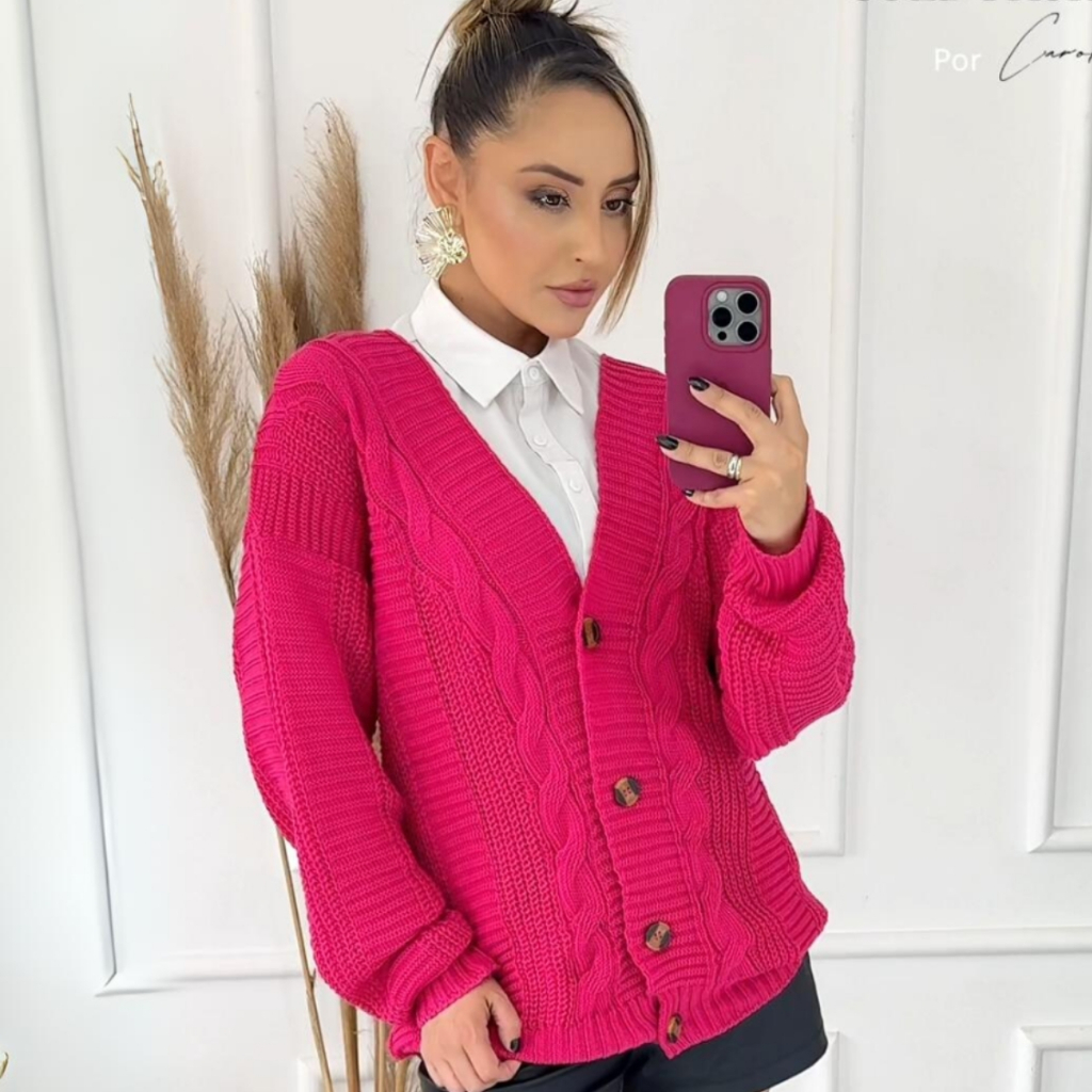 CARDIGAN OVERSIZED O shape amplo e despojado oferece uma estética contemporânea e permite a liberdade de movimentos, enquanto adiciona um toque moderno e descontraído ao seu visual. Aproveite para renovar o seu guarda-roupa com essa peça versátil e cheia de estilo! Tamanho da Peça: Comprimento: 69 cm Busto: 100 cm Cintura: 100 cm Manga: 60 cm Tamanho Único - Veste do 38 ao 46, devido a elasticidade natural do tricot. Composição: 100% Poliester Principais Detalhes: • Tricot Grossinho • Modelo Confortável • Ponto Trança e Fang em toda peça. • Cintura solta. • Foto Original do produto • Botões duráveis • Fio de Qualidade. Cuidados e Lavagem: O tricot é uma peça delicada, siga as instruções de uso e lavagem para aumentar sua durabilidade. • Dê preferência para a lavagem á mão. • Não pendure a peça no varal verticalmente. O peso da água pode deformar a roupa. • Verifique as orientações de temperatura na etiqueta antes de passar a peça. • Nunca pendure em cabides, mantenha as peças dobradas