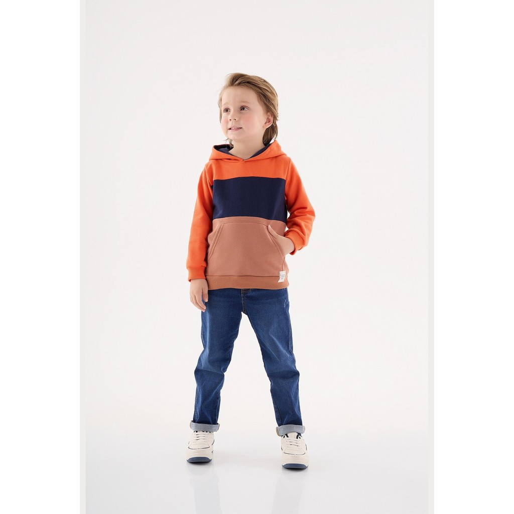 Casaco infantil Menino, confeccionado em moletom felpado. Possui capuz forrado em meia malha, recortes em cor contrastante, bolso canguru e punhos e barra em ribana.Tecido: MoletomComposição: 50% Algodão 50% Poliéster | Forro Capuz: 100% AlgodãoModelagem: AmplaComprimento Manga: LongaForro: SimDecote/Gola: V