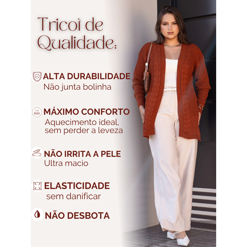 Casaco Feminino Cardigan Lã Kimono com Trança Blusa de Frio Inverno Tricot Premium