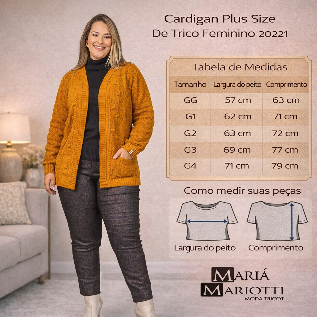 Casaco Feminino Plus Size em Tricô Aberto Sem Botões Casual Elegante Tamanhos Disponíveis: GG - G1 - G2 - G3 - G4 Tabela de Medidas: GG - Comprimento Corpo: 63 cm - Busto: 57 cm G1 - Comprimento Corpo: 71 cm - Busto: 61 cm G2 - Comprimento Corpo: 72 cm - Busto: 65 cm G3 - Comprimento Corpo: 77 cm - Busto: 69 cm G4 - Comprimento Corpo: 79 cm - Busto: 70 cm Cores Disponíveis: Preto - Rosa Fúcsia - Marrom Castor - Verde Floresta - Ouro Mostarda O casaco plus size feminino em tricô aberto sem botões é a escolha ideal para quem busca conforto, estilo e versatilidade no dia a dia. Desenvolvido especialmente para valorizar o corpo plus size, ele possui modelagem confortável, caimento elegante e tecido macio, proporcionando bem-estar em qualquer ocasião. Confeccionado em tricô de alta qualidade, esse casaco feminino plus size é perfeito para os dias mais frescos, oferecendo aquecimento na medida certa sem pesar no visual. O design aberto, sem botões, garante praticidade na hora de vestir e facilita combinações com blusas, camisetas, vestidos e regatas, tornando a peça extremamente versátil. Ideal para uso casual, trabalho, passeios ou momentos de lazer, o casaco plus size em tricô é uma peça curinga no guarda-roupa feminino. Seu acabamento cuidadoso proporciona maior durabilidade, mantendo a aparência bonita mesmo após várias lavagens. Destaques do produto: - Casaco feminino plus size em tricô - Modelo aberto, sem botões - Tecido macio, confortável e quentinho - Excelente caimento para o corpo plus size - Versátil e fácil de combinar - Ideal para meia-estação e inverno - Ótimo para looks casuais ou elegantes Indicação de uso: Perfeito para compor looks do dia a dia, trabalho, passeios, viagens e ocasiões informais. Combina facilmente com jeans, leggings, vestidos e saias. Observações: Verifique a tabela de medidas antes da compra para escolher o tamanho ideal. As cores podem sofrer pequenas variações conforme a iluminação e a tela do dispositivo. Garanta já o seu casaco plus size feminino em tricô aberto sem botões e tenha mais conforto, elegância e praticidade em todas as estações.