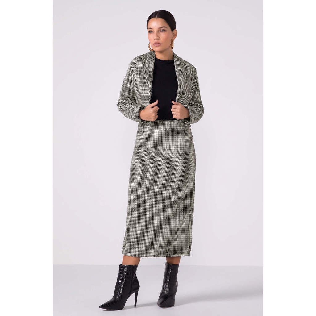 O Casaco Feminino Tweed Xadrez Marialícia traz elegância para você transformar qualquer produção! Confeccionado em tweed xadrez, que oferece um toque aconchegante para dias mais frios, a peça possui comprimento intermediário, gola estruturada e estampa clássica pied de poule, garantindo um look sofisticado e moderno, ideal para composições profissionais com personalidade. Use-o fechado ou aberto sobre vestidos, blusas ou camisas para um toque charmoso. Aposte nesse must-have para quem busca estilo e sofisticação no dia a dia! Modelo veste tamanho P. Medidas da modelo: 83cm de busto; 94cm de quadril; e 61cm de cintura.