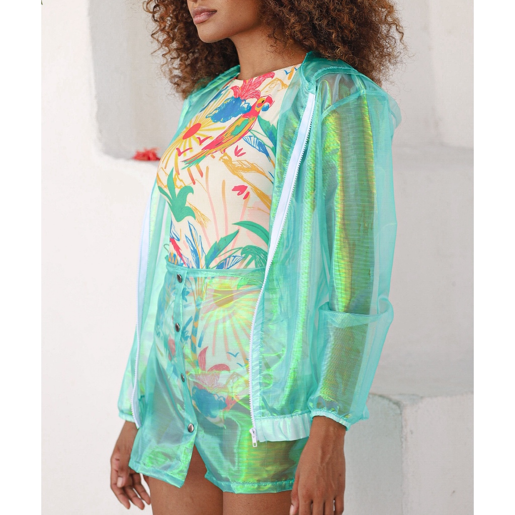 Jaqueta holográfica transparente com capuz. Detalhes: - Não possui forro. - Contém capuz. - Não possui bolso. Tecido: Organza Composição: 100% Poliéster Tamanho único, veste até 42 Medidas (cm) M Ombro 43 Busto 44 Mangas 54 Cintura 50 Quadril 41 Comprimento 64