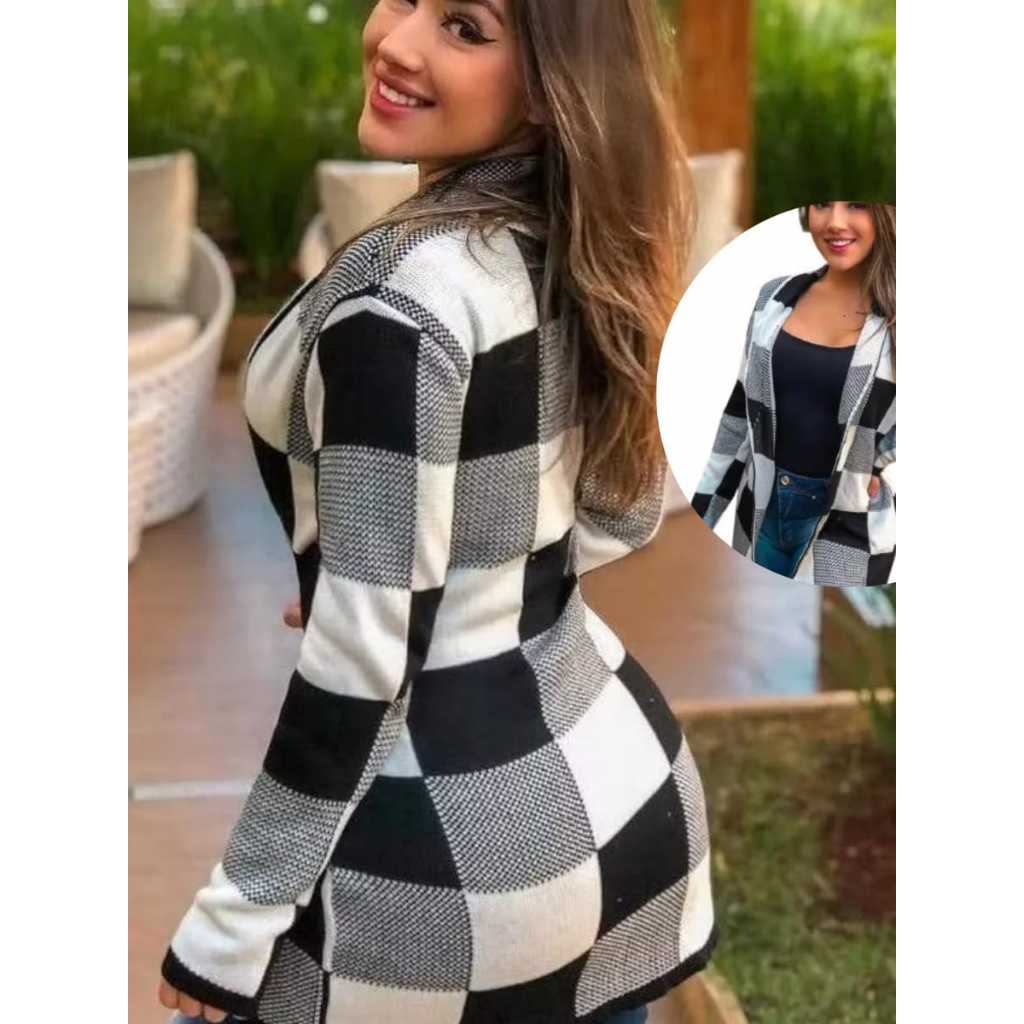 Casaco Sobretudo Feminino Plus Size Alfaiataria Xadrez Quadriculado Max Kimono de Frio Blazer Tricot